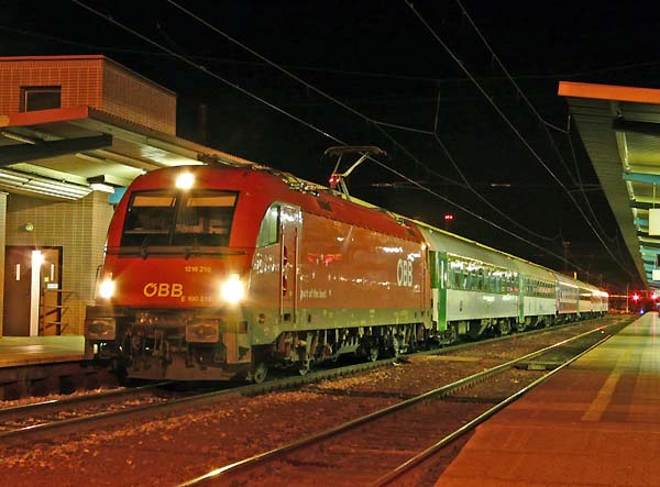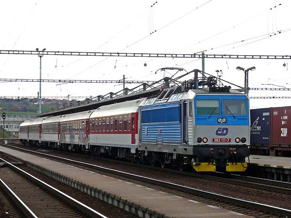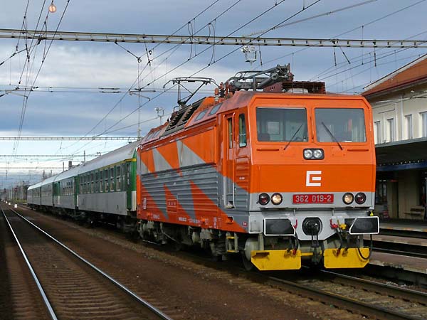 362 111 (auch eine ex 363) mit EC 136 ``Moravia´´ (Bratislava hl.st.-Bohumin) in Otrokovice