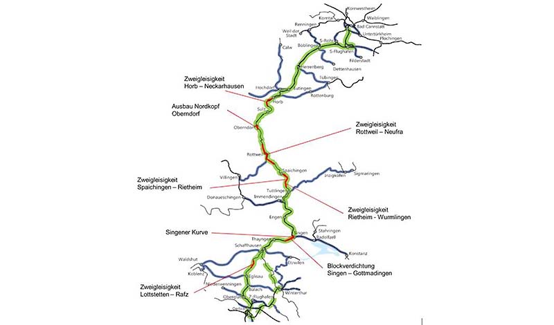 ![]() Skizze des Verlaufs der internationalen Strecke Stuttgart – Zürich inkl. der im BVWP enthaltenen Streckenausbauten |