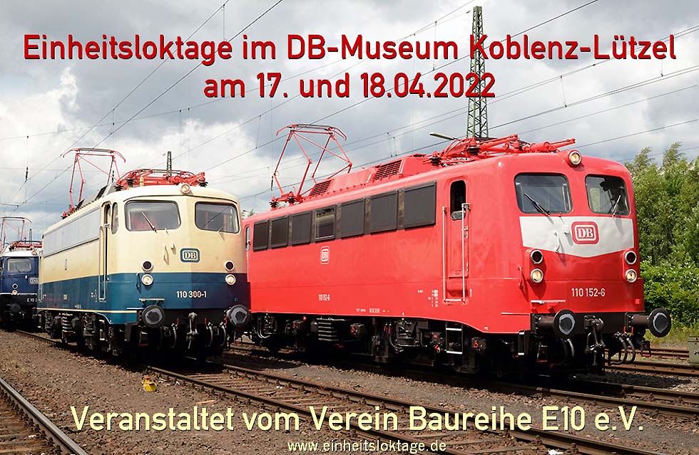 28.03.2022 Einheitsloktage im DB-Museum Koblenz-Lützel am 17. und 18. April 2022 (Ostern).. Während der Ostertage des DB-Museums Museumsstandort Koblenz-Lützel organisiert der Verein „Baureihe E10 e.V.“ am 17. und 18. April 2022 die Einheitsloktage. Was wird geboten:FahrzeugpräsentationenZwischen 10 und 16 Uhr werden an und auf der Drehscheibe des Museums die Einheitselektrolokomotiven der Baureihen E10, E40, E41 ... |