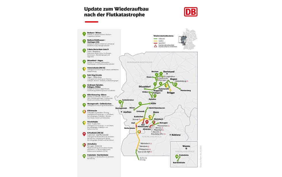 22.03.2022 Zeitplan für Gesamtaufbau der Ahrtalbahn steht.. Züge sollen 2025 wieder durchgängig von Remagen nach Ahrbrück fahrenBauarbeiten zwischen Walporzheim und Ahrbrück starten im ersten Quartal 2023 • Klimaresilienter Wiederaufbau und neueste Technik wo immer möglich • Prüfung der Elektrifizierung • Neue Info-Website zur Ahrtalbahn ab AprilDie Deutsche Bahn (DB) hat in Hei... |
