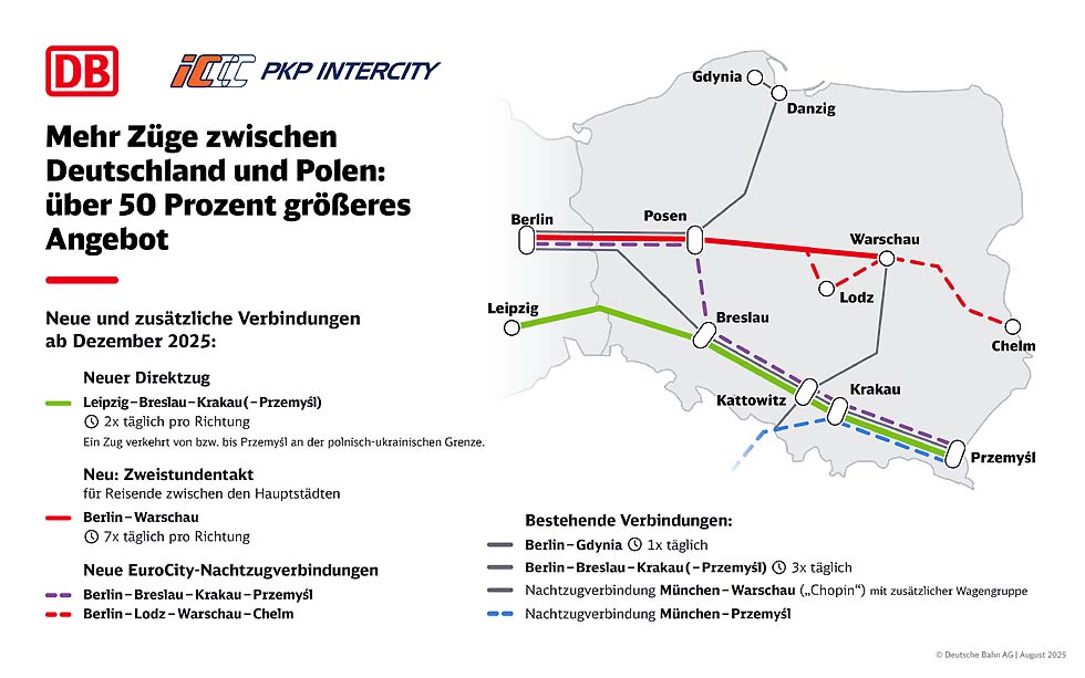 28.08.2025 Mehr Züge zwischen Deutschland und Polen.. Neuer Direktzug von Leipzig über Breslau und Krakau nach Przemysl • Zweistundentakt für Reisende zwischen den Hauptstädten Berlin und Warschau • Ab Dezember 17 tägliche VerbindungenAb Dezember sind deutlich mehr Züge zwischen Deutschland und Polen unterwegs. Die Deutsche Bahn (DB) und die polnische PKP Intercity (PKP) stoc... |