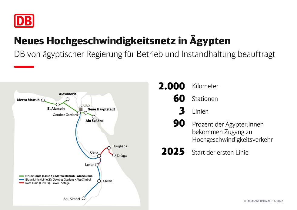 Die ägyptische Regierung vergibt den Auftrag zum Betrieb auf dem ersten Hochgeschwindigkeitsschienennetz im Land an die Deutsche Bahn. Der Vertrag zwischen Ägypten und der Deutschen Bahn wurde heute im Rahmen der UN-Klimakonferenz unterzeichnet. Das Auftragsvolumen des vorerst über 15 Jahre laufenden Vertrages liegt im einstelligen Milliardenbereich. Für die DB wird deren Tochter DB International Operations (DB IO) das größte Bahnprojekt in der Geschichte Ägyptens und mit 2.000 Streckenkilometern sechstgrößte Hochgeschwindigkeitsnetz der Welt übernehmen. Ein Konsortium um Siemens Mobility errichtet die Infrastruktur und liefert die Fahrzeuge für den Personenverkehr sowie Güterlokomotiven. Niko Warbanoff, CEO der DB E.C.O. Group: „Wir verhelfen Millionen Menschen in Ägypten zu moderner Mobilität und sorgen für klimafreundlichen Gütertransport auf der Schiene. Das neue Bahnsystem treibt die wirtschaftliche Entwicklung Ägyptens voran und sorgt für mehr Klimaschutz, von dem wir auch alle profitieren.“ Die erste Linie des Verkehrsnetzes wird bereits ab 2025 die Metropolregionen Alexandria, Kairo und New Administrative Capital verbinden („Suez-Kanal auf Schienen“). Mit zwei weiteren Strecken und 60 Stationen werden Kairo und Abu Simbel sowie Luxor mit Hurghada am Roten Meer für den Schienenverkehr erschlossen. 90 Prozent der ägyptischen Bevölkerung sollen am Ende Zugang zu dem neuen Netz haben. Bis zum Jahr 2050 wird ein Anstieg der Bevölkerung von derzeit rund 105 Millionen auf 160 Millionen Menschen prognostiziert - verbunden mit einer Überlastung des Straßenverkehrs. Die DB IO übernimmt den Betrieb von Infrastruktur und Fahrzeugen für den Hochgeschwindigkeits-, Regional- und Güterverkehr sowie die Instandhaltung der Stationen und Depots. Dafür geht die DB IO ein Joint Venture mit dem ägyptischen Unternehmen Elsewedy Electric (EE) ein. Warbanoff: „Wir freuen uns, durch den Betrieb des neuen Bahnsystems in Ägypten maßgeblich zur Verkehrsverlagerung auf die Schiene, zum aktiven Klimaschutz und zur wirtschaftlichen Entwicklung Ägyptens beizutragen. Neben der politischen Relevanz vor allem im aktiven Klimaschutz und der Wirtschaftsförderung, bietet das Projekt Potenzial für die Starke Schiene Deutschland in den Bereichen Technologiekooperation und Fachkräftesicherung.“ Das neue hochleistungsfähige Bahnsystem ist zentrale Säule im nachhaltigen Ausbau der öffentlichen Verkehrsinfrastruktur Ägyptens. Neben einer Halbierung der Reisezeit für 30 Millionen Menschen allein durch Linie 1 leistet das Projekt gleichzeitig einen Beitrag zur Verkehrssicherheit und zur Eindämmung der Luftverschmutzung. Das deutsche Bahnsystem wird von dem Mega-Projekt profitieren: Der Technologie- und Wissenstransfer und die Erkenntnisse aus der Kooperation mit Siemens Mobility kommen Projekten im Inland zugute. Die erwirtschafteten Gewinne werden in Deutschland reinvestiert. Als Spezialistin für Betrieb und Instandhaltung von Verkehrssystemen auf der Schiene ist die DB IO zuständig für internationale Betreiberprojekte außerhalb Europas. Nach den Großaufträgen in Kanada und Indien ist das Vorhaben in Ägypten das dritte große internationale Verkehrsprojekt für die DB IO im Jahr 2022.