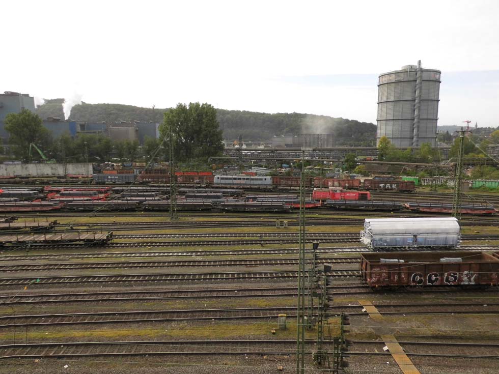 Gruppenbild mit Damen: nach dem Abstellen des Autos im Globus-Parkhaus hat man -bei geschickter Wahl des Parkdecks und Platzes- einen schönen Überblick. Von den erwähnten „Damen“ interessiert uns hier besonders die Saarrail-151 165. Nichts gegen die V90, aber wir sind hier auf elektrolok.de ..