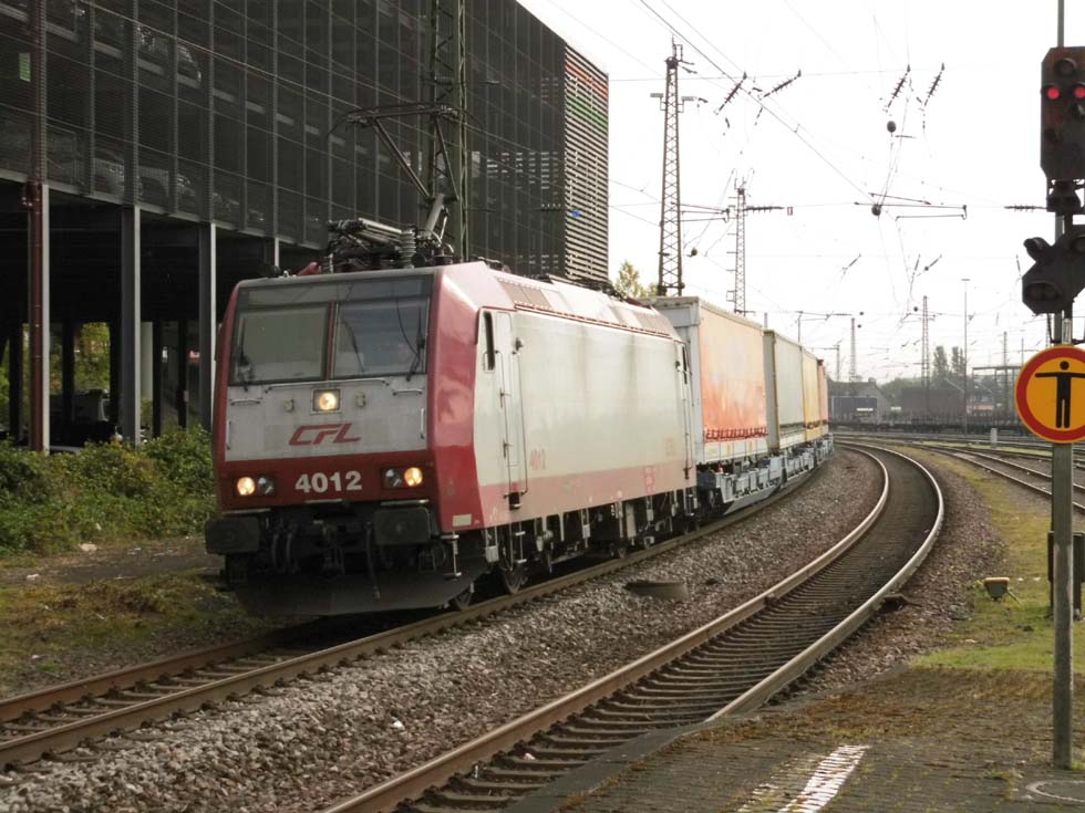 Die CFL 4012 schnürt mit einem Aufliegerzug vor dem Parkhaus am Bahnhof entlang.