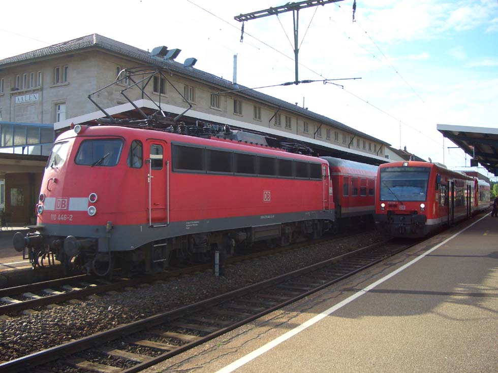 Die DB 110 446-2 (91 80 6110 446-2 D-DB zum Aufnahmezeitpunkt Bh Stuttgart, dort beheimatet von 30.01.1998 bis 06.11.2013, dazwischen Bh München West 12.12.2009 - 02.09.2010, z 23.08.2013, A 06.11.2013, zerlegt 04.2014 Fa. Steil/Eschweiler-Aue) war am Samstagabend des 30.05.2009 mit ihrem n-Wagen-Wendezug gerade auf Gleis 1 in Aalen Hbf angekommen. Der Zug wendet hier und fährt wieder Richtung Nördlingen/Donauwörth ins Bayrische zurück.