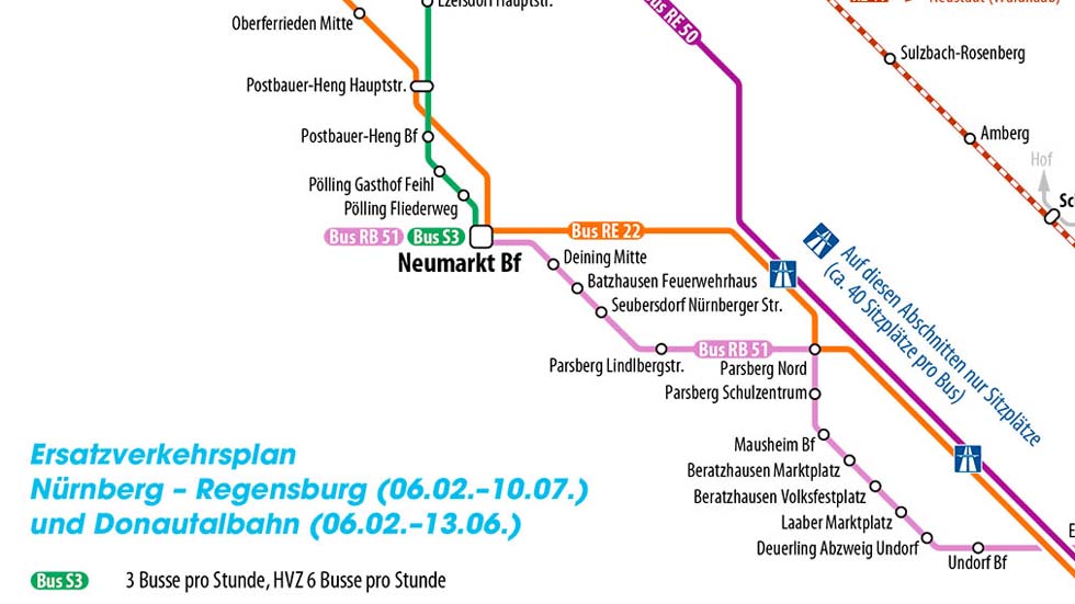 Generalsanierung Nürnberg – Regensburg: BEG veröffentlicht Ersatzkonzept für Regionalverkehr„Die Generalsanierungen im nächsten Jahr machen den bislang umfangreichsten Ersatzverkehr notwendig, seit vor 30 Jahren die Zuständigkeit für den bayerischen Regionalverkehr auf den Freistaat übergangen ist. Das ist für uns der Lackmustest schlechthin für die noch weiter folgenden Generalsanierungen im Freistaat“, sagt Bayerns Verkehrsminister Christian Bernreiter, der zugleich Aufsichtsratsvorsitzender der BEG ist. „Das ist eine Riesenherausforderung für uns und für alle Beteiligten. Unser Ziel ist es dafür zu sorgen, dass die Kunden in der Region trotz der Streckensperrung weiterhin öffentlich mobil bleiben. Wir haben uns daher intensiv vorbereitet und viel Planungsarbeit in das Ersatzkonzept gesteckt“, betont BEG-Geschäftsführerin Bärbel Fuchs. Obwohl weniger Züge fahren und sich der Bund und DB InfraGO an den Ersatzverkehren beteiligen, muss der Freistaat mehr Geld in dieses Angebot im Vergleich zum regulären Betrieb stecken. Die bayerische Summe für die Zusatzkosten des Ersatzverkehrs während der kompletten Korridorsanierung Nürnberg – Regensburg – Passau liegt bei rund 28 Millionen Euro. „Wir tragen damit mehr als ein Scherflein dazu bei, dass der Ansatz von Bund und DB mit den Langzeitsperrungen im Bahnland Bayern zum Erfolg wird“, erklärt Minister Bernreiter ergänzend. Leistungsstarkes Ersatzkonzept auf Straße und Schiene Das Ersatzverkehrskonzept der BEG während der Generalsanierung Nürnberg – Regensburg setzt auf eine Mischung aus Expressbuslinien, die nur an wenigen zentralen Stationen halten, und Linien mit vielen Zwischenhalten, die auch die kleineren Orte bedienen. Auf diese Weise kombiniert die BEG möglichst attraktive Fahrtzeiten mit der Anbindung aller Orte, an denen normalerweise Regionalzüge halten. Die Linienführung der Ersatzbusse weicht deshalb teilweise deutlich von der Linienführung der Züge ab. Wie bei allen Schienenersatzverkehren lässt sich eine Verlängerung der Fahrtzeiten gegenüber dem Zugverkehr in den meisten Fällen allerdings nicht vermeiden. Um zusätzliche Fahrgäste aufnehmen zu können, bestellt die BEG zudem bei DB Regio auf der Regionalzuglinie RE 40 von Nürnberg über Schwandorf nach Regensburg mehr Kapazitäten: Die meisten Züge des RE°40 fahren während der Generalsanierung Nürnberg – Regensburg mit zwei bis drei gekuppelten Fahrzeugen. Einige bislang nur im Abschnitt Nürnberg – Schwandorf verkehrende Züge werden bis Regensburg verlängert, so dass bis circa 23 Uhr zwischen Nürnberg und Regensburg ein durchgehender Stundentakt angeboten wird. Die Gesamtfahrtzeit ist im RE 40 mit rund einer Stunde und vierzig Minuten etwas kürzer als bei den Expressbussen. An der Umsetzung des Ersatzverkehrs mit Bussen sind sowohl Infrastrukturbetreiber, Eisenbahnverkehrsunternehmen als auch Busunternehmen beteiligt: DB InfraGO hat Rahmenverträge vergeben an Busunternehmen, bei denen die Verkehrsunternehmen Agilis und DB Regio die durch die Generalsanierung benötigten Busleistungen abrufen. Einschränkungen des Regionalverkehrs auf weiteren Strecken Neben dem Komplettausfall der Züge auf der Bahnstrecke Nürnberg – Regensburg kommt es auch auf angrenzenden Regionalzuglinien zu Einschränkungen. Der Grund dafür ist, dass Fern- und Güterzüge über andere Routen umgeleitet werden und der Regionalverkehr deshalb auch auf diesen Strecken auf Fahrten verzichten muss. Ausgedünnt wird das Bahnangebot insbesondere beim Donau-Isar-Express RE°3 zwischen München und Plattling sowie bei den Linien RB 17 und RE 18 auf der Donautalbahn zwischen Neustadt a. d. Donau und Regensburg. Hinzu kommen Einschränkungen im Raum Augsburg sowie beim RE 1 zwischen München und Ingolstadt. „Auch abseits der gesperrten Bahnstrecke Nürnberg – Regensburg werden ausfallende Züge durch Busse ersetzt. Allerdings nur dann, wenn die Busse für die Fahrgäste auch tatsächlich einen Mehrwert bieten“, erklärt die BEG-Geschäftsführerin. „Mancherorts erübrigt sich ein Ersatzverkehr, weil Busse das Ziel aufgrund der längeren Fahrtzeit später erreichen würden als der nachfolgende deutlich schnellere Zug. Abgesehen von dieser Regel gilt: Die tatsächliche Nutzung des Ersatzverkehrs durch die Fahrgäste lässt sich trotz aller Verkehrsdaten nur schwer vorhersagen. Wir werden uns deshalb die Situation nach Start der Generalsanierung genau anschauen und beim Ersatzverkehrskonzept gegebenenfalls dort nachsteuern, wo dies erforderlich ist.“ Ab 14. Juni 2026 folgt durch weitere Streckensperrungen eine Anpassung des Ersatzkonzepts in der Region um Plattling. Informationen dazu veröffentlicht die BEG zu einem späteren Zeitpunkt. Mehr Informationen zum Thema Generalsanierung Nürnberg – Regensburg und zu den Ersatzverkehren auch in der heutigen Pressemitteilung der DB: https://www.deutschebahn.com/de/presse/presse-regional/pr-muenchen-de(öffnet in neuem Fenster) Quelle:/Fotos: Bayerische Eisenbahngesellschaft |