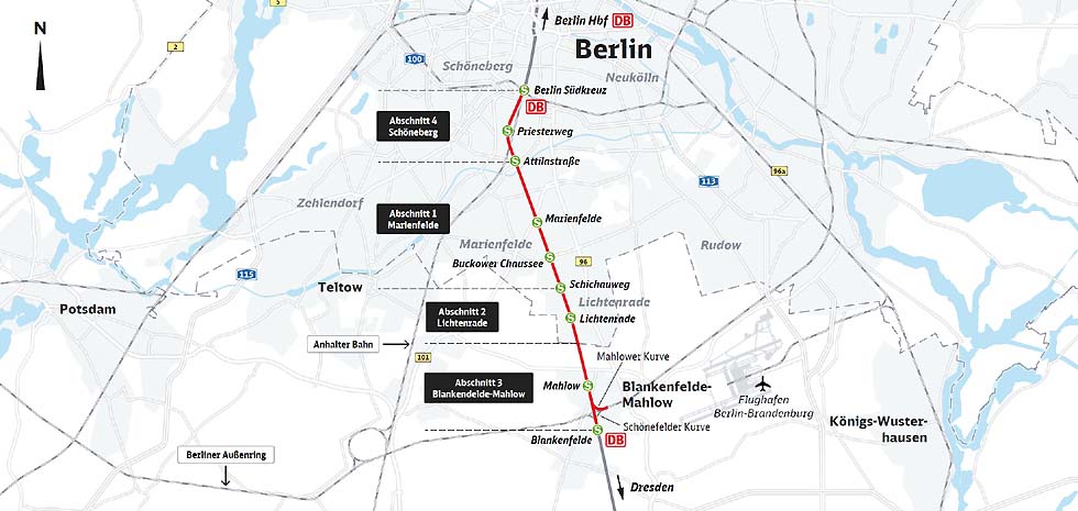 Die Deutsche Bahn (DB) hat eines der wichtigsten Bauvorhaben pünktlich zum Fahrplanwechsel abgeschlossen: Ab 14. Dezember rollt der Verkehr wieder über die Dresdner Bahn und erstmals fahren auch Regional- und Fernverkehrszüge von Berlin Richtung Süden über diese mit zwei neuen Gleisen und Oberleitung wiederaufgebaute Strecke. Durch die direkte Linienführung über die Dresdner Bahn kann die Fahrzeit der Flughafenexpresslinie (FEX) ab Berlin Hbf zum Flughafen BER von bisher 39 Minuten auf etwa 23 Minuten nahezu halbiert werden. Fernverkehrsreisende können künftig Dresden und Prag rund 10 Minuten schneller erreichen. Mit einer Sonderzugfahrt von Berlin Südkreuz zum Flughafen Berlin Brandenburg (BER) nahmen Philipp Nagl, Vorsitzender des Vorstands DB InfraGO AG, und Patrick Schnieder, Bundesminister für Verkehr, Ute Bonde, Berliner Senatorin für Mobilität, Verkehr, Klimaschutz und Umwelt, Detlef Tabbert, Brandenburger Minister für Infrastruktur und Landesplanung sowie Regina Kraushaar, Staatsministerin für Infrastruktur und Landesentwicklung des Freistaats Sachsen die Dresdner Bahn für ein verbessertes Bahnangebot in Betrieb. Patrick Schnieder: „Durch den Ausbau der Dresdner Bahn profitiert die Hauptstadtregion von einer schnelleren Anbindung an den Flughafen BER, einer besseren Anbindung des Regionalverkehrs aber auch der internationalen Verkehre Richtung Südosteuropa. Herzlichen Dank an alle, die an diesem Projekt mitgewirkt haben. Der heutige Tag beweist, dass auch scheinbar unendliche Geschichten ein gutes Ende finden können. Er zeigt aber auch, dass wir beim Planen und Bauen dringend schneller werden müssen. Eine entsprechende Initiative habe ich bereits aufs Gleis gesetzt. Denn von Ausbauvorhaben wie diesem profitieren Menschen und Wirtschaft enorm – in den Regionen und weit darüber hinaus.“ Philipp Nagl: „Dieses wichtige Ausbauprojekt zeigt, wie wir mit neuer und verbesserter Infrastruktur das Angebot auf der Schiene für Reisende und Kund:innen im Güterverkehr ausweiten können. Zudem entlasten zusätzliche Gleise den gesamten Berliner Bahnknoten, was sich ebenfalls positiv auf die Stabilität des Zugverkehrs auswirken wird. Zusammen mit der umfangreichen Modernisierung der Anhalter Bahn, die nun ebenfalls pünktlich abgeschlossen ist, haben die Mitarbeiterinnen und Mitarbeiter eine Mammutaufgabe erfolgreich geschafft.“ Ute Bonde: „Ich möchte mich bei allen bedanken, die die Dresdner Bahn als Weg zur BER-Anbindung aus ihrem Dornröschenschlaf wecken. Der Flughafenexpress und die damit möglichen Verbesserungen auf anderen Strecken bringen uns in dieser Sache ein gutes Stück weiter. Die längliche Umleitung über Gesundbrunnen und Ostkreuz kann nun entfallen, die Fahrzeit ab Hauptbahnhof sinkt von ca. 38 Minuten auf nun 23 Minuten. Der Flughafenexpress bindet die wichtigen Umsteigeknoten Hauptbahnhof, Potsdamer Platz und Südkreuz an. Fast alle Berlinerinnen und Berliner werden von den Reisezeitverkürzungen profitieren. Mit Entfall der Interimsanbindung des BER werden Kapazitäten für weitere Verbesserungen frei: Eine neue Direktverbindung von Hohenschönhausen, Lichtenberg, Ostkreuz und Schöneweide zum BER fährt auf den Linien RB24 und RB32 zweimal pro Stunde. Damit stärken wir die Anbindung des BER aus den östlichen Bezirken Berlins.“ Detlef Tabbert: „Die Inbetriebnahme der Dresdner Bahn ist ein Meilenstein für den Schienenverkehr in Brandenburg. Durch die neuen Fernbahngleise ab Blankenfelde werden Pendler aus Teltow-Fläming, Dahme-Spreewald und dem Süden schneller in die Hauptstadtregion und zum Flughafen BER kommen. Gleichzeitig stärken wir den europäischen Güterverkehrskorridor und schaffen mehr Kapazitäten für ein stabiles, klimafreundliches Bahnangebot – von Mahlow über Lübbenau bis Elsterwerda.“ Regina Kraushaar: „Es ist geschafft! Mit der neuen Dresdner Bahn schließen wir eine zentrale Lücke im deutschen Schienennetz. Die Dresdner Bahn macht die Wege zwischen den Metropolen leichter und gibt unseren Wirtschaftsräumen starke Impulse. Und nicht zuletzt zeigt sie, dass wir den Ausbau moderner, schneller Schieneninfrastruktur gemeinsam umsetzen können. Ein nächstes wichtiges Projekt steht in den Startlöchern: Nun muss auch die Neubaustrecke Dresden–Prag mit dem Erzgebirgstunnel aufs sprichwörtliche Gleis gesetzt werden.“ Östlich der bestehenden S-Bahn-Trasse entstanden auf 16 Kilometer Länge zwei neue elektrifizierte Fernbahn-Gleise. Die DB hat zudem alle neun Bahnübergänge durch Eisenbahn- oder Straßenüberführungen ersetzt. Die gesamte Strecke wurde mit Elektronischer Stellwerkstechnik ausgerüstet. Im Berliner Stadtgebiet, zwischen Südkreuz und Lichtenrade, können nun Züge schneller mit einer Geschwindigkeit von bis zu 160 km/h fahren, ab Landesgrenze Berlin/Brandenburg sogar 200 km/h. Insgesamt haben DB, Bund und Länder rund 1,1 Mrd. Euro investiert. Im Oktober 2017 hatten die vorbereitenden Arbeiten begonnen. Am 5. Februar 2019 war offizieller Beginn der Bauarbeiten. Die Dresdner Bahn existiert bereits seit 1875. Sie beginnt südlich des Bahnhofs Berlin Südkreuz, wo die Strecke von der Anhalter Bahn abzweigt. Die Dresdner Bahn führt über die Berliner Ortsteile Marienfelde und Lichtenrade zur Stadtgrenze, von dort weiter über Mahlow und Blankenfelde in Richtung Dresden. Sie ist Teil des europäischen Güterverkehrskorridors 7, der die strategisch wichtigen Häfen der Nord- und Ostsee mit dem Schwarzen Meer und dem Mittelmeer verbindet. Während der letzten Monate hat die DB InfraGO auch die Anhalter Bahn zwischen Berlin Südkreuz und Bitterfeld überholt. Sie hat 33 neue Weichen eingebaut und weitere 59 Weichen instandgesetzt. Knapp 100 Kilometer Gleise wurden vollständig erneuert, weitere 38 Kilometer saniert. Ab 14. Dezember 2025 ist wieder freie Fahrt für die Züge zwischen Berlin und Leipzig/Halle.