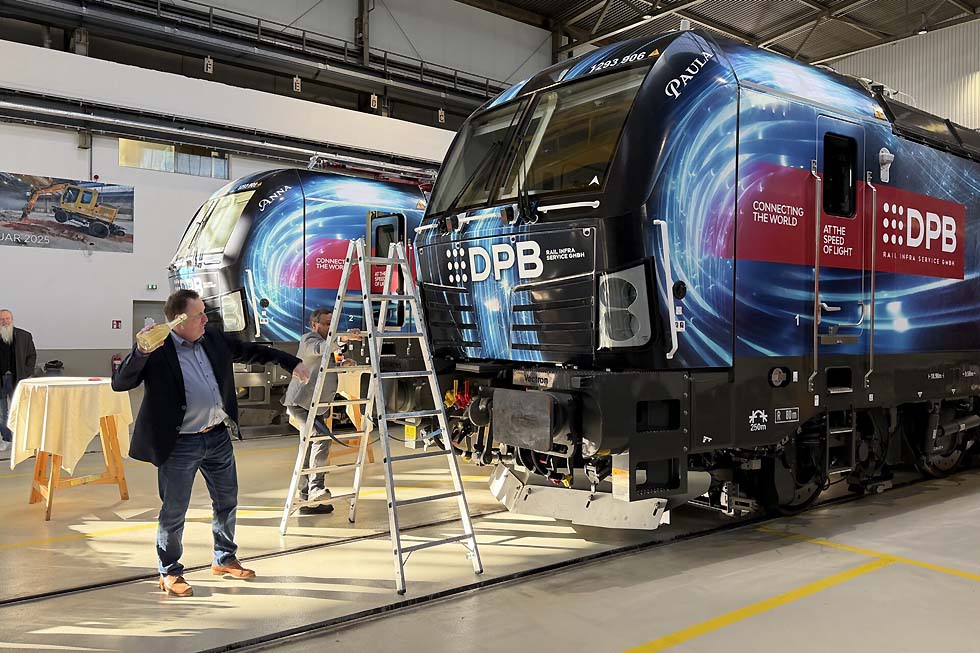 Zum Jahresbeginn 2026 hat die DPB Rail Infra Service GmbH ihren Fuhrpark um zwei neue Vectron-Lokomotiven der Varianten A17 und A10 von Siemens Mobility erweitert. Die Fahrzeuge wurden bereits am 13. Januar 2026 in Dessau übernommen, nach Krieglach überstellt und dort im DPB-Design foliert sowie für den internationalen Einsatz vorbereitet. Der offizielle Empfang erfolgte am 23. Januar am Standort der DPB Rail Technical Service GmbH in Krieglach und wurde im Rahmen einer traditionellen Lok-Taufe im kleinen Kreis gemeinsam mit langjährigen GeschäftspartnerInnen gefeiert. Als Zeichen der partnerschaftlichen Zusammenarbeit nahmen Wilhelm Moser, geschäftsführender Gesellschafter der DPB Rail Infra Service GmbH, und Tanja Kienegger, Geschäftsführerin der Siemens Mobility Austria GmbH, die Sekt-Taufe vor. Die beiden Lokomotiven tragen die Namen „Anna“ und „Paula“, und setzen damit die Tradition der Namensgebung fort – benannt nach den Großmüttern von Wilhelm Moser. Begleitet von einem gemütlichen Beisammensein mit Speis und Trank verließen die neuen Lokomotiven kurz darauf die Hallen, um ihren ersten Arbeitseinsatz in Richtung Slowakei anzutreten. Die DPB Rail Infra Service GmbH blickt auf ein dynamisches Jahr: Zwei weitere Vectron-Lokomotiven von Siemens Mobility werden bereits Ende Februar 2026 erwartet und setzen das konsequente Wachstum der Flotte für den internationalen Güterverkehr fort. Quelle:/Fotos: DPB Rail Infra Service GmbH | |
