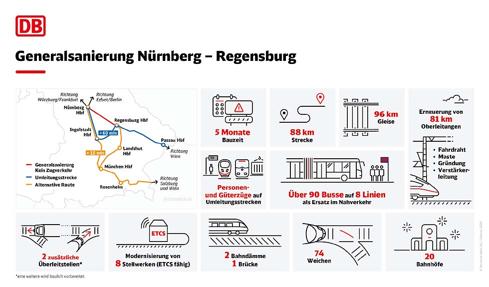 Baustart in Bayern: DB InfraGO beginnt mit der Sanierung des Bahnkorridors Nürnberg – Regensburg DB bündelt bis zum 10. Juli umfangreiches Bauprogramm an der Strecke und an den Bahnhöfen • Fahrgäste bleiben dank eines umfassenden Verkehrskonzepts mobil • Umleitungen im Fern- und Güterverkehr • Ersatzbusse und Kapazitätsverstärkungen für ausfallende Regionalzüge Die DB InfraGO beginnt mit der Generalsanierung der wichtigen Bahnstrecke Nürnberg – Regensburg. Gerd-Dietrich Bolte, Vorstand für Infrastrukturplanung und -projekte der DB InfraGO, der Parlamentarische Staatssekretär beim Bundesminister für Verkehr, Ulrich Lange, und der Bayerische Verkehrsminister Christian Bernreiter haben heute Mittag in Neumarkt (Oberpfalz) auf einer der rund 60 Baustelleneinrichtungsflächen das offizielle Startsignal gegeben. In den Abendstunden schaltet das Bauteam die Oberleitungen auf der Strecke ab und die fünfmonatige Bauphase in Form einer Vollsperrung beginnt. Züge des Fern- und Güterverkehrs werden umgeleitet, für die ausfallenden Regionalzüge sind hochwertige Ersatzbusse im Einsatz, zudem werden im Regionalverkehr auf einer alternativen Bahnverbindung von Nürnberg nach Regensburg die Kapazitäten erhöht. Zeitgleich beginnt auch die Generalsanierung der Bahnstrecke Hagen – Wuppertal – Köln in Nordrhein-Westfalen. Hohes Bauvolumen auf der Strecke Nürnberg – Regensburg Die rund 88 Kilometer lange Bahnstrecke zwischen Nürnberg und Regensburg gehört mit über 350 Zügen täglich zu den verkehrsreichsten Strecken in Bayern. Die Strecke ist ein wichtiger Bestandteil der europäischen Verkehrsachse Rhein-Donau und ist gleichzeitig ein überaus wichtiger Baustein der Bahnverkehre von und nach Österreich. Die Strecke gilt als hochbelastet, die Infrastruktur ist teilweise veraltet und sehr störanfällig. Während der Sanierung werden die pünktlichkeitsrelevanten Gewerke wie Gleise und Oberleitungen umfangreich erneuert. Ziel der fünfmonatigen Bauphase ist es, die Bahnstrecke langfristig widerstandsfähiger und stabiler zu machen. Störungen und Verspätungen sollen sich so deutlich reduzieren. Dafür setzt die DB InfraGO zwischen Nürnberg und Regensburg – nach Abschluss aller Detailplanungen – auf die Erneuerung oder umfassende Instandhaltung von 96 Kilometern Gleise, 74 Weichen und 81 Kilometern Oberleitung inklusive Fahrdraht, Maste, Gründungen und Verstärkerleitung. Für mehr Flexibilität bei Störungen auf der Strecke entstehen zwei zusätzliche Weichenverbindungen (Überleitstellen), eine weitere wird baulich vorbereitet. Hinzu kommt die Sanierung der Bahndämme bei Deining und Pölling sowie einer Brücke bei Burgthann. Die Leit- und Sicherungstechnik wird modernisiert und der Einbau des modernen Zugbeeinflussungssystems ETCS vorbereitet. Die Innenanlagen von acht Stellwerken werden dafür erneuert. Darüber hinaus profitieren die Fahrgäste von attraktiveren Stationen. Die DB modernisiert alle 20 Bahnhöfe zwischen Feucht und Regensburg-Prüfening nach einem ganzheitlichen und klaren Qualitätsstandard. Der barrierefreie Ausbau steht dabei im Fokus. Umfangreiches Busangebot und Umleitungen im Fern- und Güterverkehr Während der Bauarbeiten vom 6. Februar (21 Uhr) bis 10. Juli ist auf der Strecke kein Zugverkehr möglich. Die Fahrgäste bleiben aber dank eines umfassenden Verkehrskonzepts, das die DB InfraGO gemeinsam mit der Bayerischen Eisenbahngesellschaft (BEG) und den Eisenbahnverkehrsunternehmen vor Ort erarbeitet hat, mobil. Der Ersatzverkehr umfasst den Korridor zwischen Nürnberg Hauptbahnhof und Regensburg Hauptbahnhof sowie die Umleiterstrecken Neustadt (Donau) – Regensburg und Landshut – Plattling. Die S-Bahn-Linie S2 von Altdorf nach Nürnberg über Feucht ist von der Sperrung nicht betroffen. Lediglich an Wochenenden nachts fahren auch hier Ersatzbusse. Für den Nahverkehr ergeben sich umfangreiche Änderungen auf den Linien S3, RE 22, RE 50 und RB 51 zwischen Nürnberg und Regensburg, außerdem auf den Linien RB 17/RE 18 und RE 3. Die Linien werden jeweils mit Ersatzbussen bedient. Zur Hauptverkehrszeit werden Verstärkerbusse eingesetzt. Als Ersatz für Züge im Nahverkehr kommen entlang der gesamten Strecke Nürnberg – Regensburg sowie auf den angrenzenden Umleiterstrecken in Spitzenzeiten über 90 Busse zum Einsatz. Diese verkehren auf acht Linien und legen täglich über 45.000 Kilometer zurück. Der zwischen Nürnberg und Regensburg via Schwandorf verkehrende RE 40 wird verstärkt, ebenso die im Zweistundentakt verbleibenden Züge auf den Linien RB 17 und RE 3. Die genauen An- und Abfahrtszeiten der Züge und Busse sind in den elektronischen Auskunftsmedien enthalten. Fahrgäste können die Fahrten der Ersatzbusse zudem online über eine LiveMap einsehen. Für die Ersatzverkehre während der Generalsanierungen hat die DB in Abstimmung mit den im Nahverkehr zuständigen Aufgabenträgern einheitliche Qualitätsvorgaben sowie ein konsistentes Erscheinungsbild in der Farbe Verkehrspurpur definiert. Dazu gehören unter anderem neuwertige und barrierefrei zugängliche Fahrzeuge, die über WLAN und digitale Anzeiger für Echtzeitinformationen sowie zum Teil über Toiletten an Bord verfügen. Im Fernverkehr wird bis 13. Juni ein Teil der ICE-Züge zwischen Nürnberg und Regensburg über Ingolstadt und die Donautalbahn umgeleitet. Die Fahrzeit verlängert sich um rund eine Stunde. Zusätzlich wird eine ICE-Fahrt je Tag und Richtung von München über Landshut, Regensburg und Passau nach Wien fahren. Für Reisen zwischen Deutschland und Österreich stehen weiterhin auch die zweistündlichen Züge zwischen München und Wien via Salzburg zur Verfügung. In Regensburg, Passau und Plattling ist das Fernverkehrsangebot in dieser Phase reduziert, in Straubing können keine Fernzüge halten. Ab 14. Juni gibt es wegen des Starts der Generalsanierung Regensburg – Passau weitere Einschränkungen im Fernverkehr zwischen Nürnberg, Regensburg, P