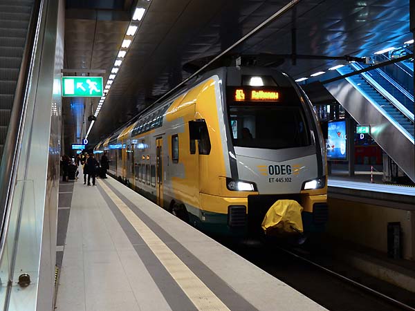 Erster ODEG-KISS im Planeinsatz Seit 08.01.2013 ist nun endlich der erste KISS der ODEG zunächst auf dem RE 4 mit ET 445.102 unterwegs. Die Bilder zeigen den Zug als RE37313 von Rathenow nach Ludwigsfelde in Elstal sowie als RE37316 von Ludwigsfelde nach Rathenow im Berliner Hauptbahnhof