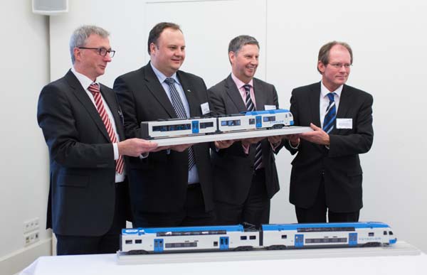 WestfalenBahn: Alpha Trains produziert 28 Regionaltriebzüge von StadlerIm Auftrag von Alpha Trains produziert der Berliner Schienenfahrzeughersteller Stadler Pankow GmbH insgesamt 28 Regionaltriebzüge. Ab Dezember 2015 werden 15 Züge vom Typ FLIRT auf der Emsland-Linie und 13 Züge vom Typ KISS auf der Mittelland-Linie von der WestfalenBahn eingesetzt. Das gaben die Unternehmen heute im Rahmen der offiziellen Vertragsunterzeichnung vor Journalisten in Osnabrück bekannt. Die WestfalenBahn hatte sich 2012 in zwei europäischen Ausschreibungswettbewerben durchgesetzt und von der Landesnahverkehrsgesellschaft Niedersachsen (LNVG) und ihren Partnern den Zuschlag für einen jeweils 15jährigen Verkehrsvertrag erhalten.„Die modernen elektrischen Doppelstocktriebfahrzeuge des Typs KISS kommen in Niedersachsen erstmals zum Einsatz“, unterstreicht Michael Daum, Geschäftsführer der Stadler Pankow GmbH und weist daraufhin, dass Stadler-FLIRT-Triebzüge sich bereits seit 2007 in Nordrhein-Westfalen bewähren. „Wir freuen uns, dass wir nun weitere FLIRTs und KISS für Alpha Trains bzw. die WestfalenBahn produzieren dürfen, mit diesem Auftrag weiten wir unser bisheriges Engagement für einen modernen und umweltfreundlichen Nahverkehr aus. Die Züge zeichnen sich u.a. durch eine effiziente Energierückgewinnung mit über 20 Prozent Rückspeisequote aus.“ „Wir freuen uns, dass es uns - gemeinsam mit Stadler und unseren Partnerbanken - gelungen ist, die WestfalenBahn mit einem wettbewerbsfähigen Angebot beim Gewinn der beiden Lose Emsland und Mittelland zu unterstützen“, erläutert Shaun Mills, Chief Executive Officer der Alpha Trains. „Mit dem Erwerb der modernen Stadler Schienenfahrzeuge und der Übernahme des vollen Restwertrisikos durch Alpha Trains hat die WestfalenBahn die notwendige Flexibilität dynamisch und gleichzeitig wirtschaftlich auf die rasche Entwicklung des regionalen Schienenverkehrsmarktes zu reagieren“, so Shaun Mills weiter. „Die neuen Triebzüge lösen die heutigen roten Doppelstockzüge mit Lokomotiven ab und bieten unseren Fahrgästen künftig mehr Platz, Komfort und Sicherheit“, ergänzt Rainer Blüm, Geschäftsführer der WestfalenBahn. „So profitieren gehbehinderte Menschen oder Fahrradtouristen von weitgehend barrierefreien Einstiegen und vielen stufenlos begehbaren Wagenbereichen. Für eine bessere Information sorgen künftig große Info-Bildschirme. Zusätzlich sind alle Wagen mit Video-Überwachung ausgerüstet.“ „Wettbewerb im Schienennahverkehr funktioniert am besten über den Einsatz moderner, komfortabler Züge“, erläutert LNVG-Geschäftsführer Hans-Joachim Menn und weist darauf hin, dass die LNVG dem Ausschreibungsgewinner häufig neue Fahrzeuge über ihren Fahrzeugpool zur Verfügung stelle. Bei größeren, gerade auch länderübergreifenden Eisenbahnnetzen sei dies aber nicht immer machbar. Vor diesem Hintergrund sei es wichtig, dass hier drei kompetente Partner Finanzierung, Beschaffung und Produktion der neuen Züge gemeinsam schulterten, betont Menn, dessen Gesellschaft jährlich knapp 300 Millionen Euro für die Bestellung von Nahverkehrszügen zwischen Ems und Elbe ausgibt. Speziell für die Emslandstrecke (RE 15) Münster – Rheine – Lingen – Leer – Emden sind die 15 einstöckigen vierteiligen FLIRT-Elektrotriebwagen konzipiert. Die Triebwagen lassen sich leicht kuppeln, die Kapazität kann daher zügig der stark schwankenden Nachfrage angepasst werden. Es werden stets ein oder zwei Triebwagen verkehren und damit bis zu 430 komfortable Sitzplätze bieten – davon bis zu 30 in der 1. Klasse -, bis zu vier WCs und viele Fahrradabstellplätze – im Sommer bis zu 84 und im Winter bis zu 48. Ein stufenloser und damit barrierefreier Einstieg ist möglich an allen modernisierten Stationen wie Münster, Emsdetten, Rheine, Leschede, Lingen, Meppen, Haren, Dörpen, Papenburg, Leer, Emden Hbf und Emden Außenhafen, an allen weiteren Stationen helfen die Schiebetritte. Die 13 doppelstöckigen sechsteiligen KISS-Triebwagen sind ausgelegt für die Mittellandlinien RE 60 Rheine – Osnabrück – Minden – Hannover – Braunschweig und RE 70 zwischen Bielefeld – Herford – Minden – Hannover – Braunschweig . „Mit den neuen Doppelstockzügen bieten wir in allen Zügen immer die hohe Kapazität von 626 Sitzplätzen an, davon 34 in der 1. Klasse“, sagt Rainer Blüm. „Für die Kunden ergeben sich dann keine Unterschiede mehr zwischen den beiden Linien oder zwischen Takt- und Verstärkerzügen.“ Die Züge verfügen über vier WCs und bieten im Sommer mindestens 30 Plätze für Fahrräder, im Winter bis zu 18. Alle 28 Triebwagen zeichnen sich durch hohe Spurtstärke, eine Höchstgeschwindigkeit von 160 Km/h sowie einen geringeren Energieverbrauch aus. Komfortable Sitzabstände, Steckdosen, Klimatisierung und umfassende Möglichkeiten zur Gepäckablage erhöhen den Komfort für die Fahrgäste. Jeder der 28 Triebwagen verfügt über mehrere WCs, von denen eines nach den neuesten Regeln für die Nutzung durch mobilitätseingeschränkte Personen ausgelegt ist.