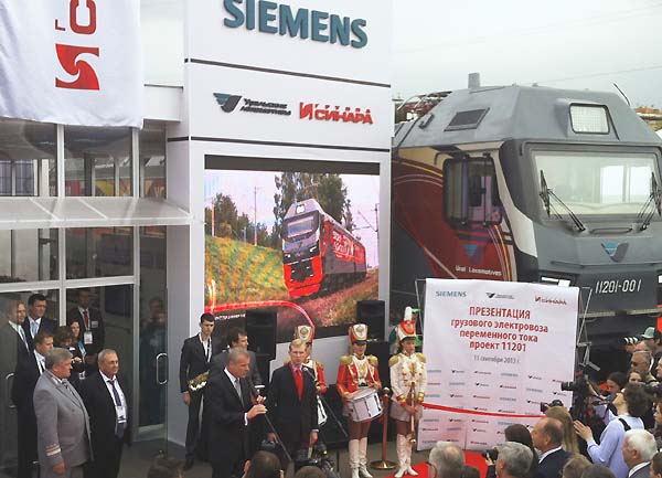 AC-Lok für „Raum 1520“ vorgestelltIm Rahmen der Bahnmesse „Expo 1520” in Moskau, Russland, wurde die neue 25-kV-Drehstromlokomotive für den Frachtverkehr in Staaten mit 1520-Millimeter-Spurbreite vorgestellt. Die Lok vom Typ AC 11201 wurde von Ural Locomotives entwickelt, einem Joint Venture von Siemens und der Sinara Gruppe. Die Antriebstechnik der Lok stammt von Siemens.Im Juli 2013 wurde der erste Prototyp der Lokomotive fertiggestellt und hat seitdem mehr als 5.000 Testkilometer absolviert. Derzeit laufen die Tests für die Zulassung der Lok. Sie werden bis voraussichtlich April 2014 andauern und finden hauptsächlich auf dem Eisenbahnversuchsring des Allrussischen wissenschaftlichen Forschungsinstituts für Eisenbahntransport in Schtscherbinka bei Moskau statt. „Die neue Lokomotive bietet innovative und energieeffiziente Technologie und wurde von unseren russischen und deutschen Ingenieuren in Rekordzeit entwickelt“, sagte Jochen Eickholt, CEO der Division Rail Systems, anlässlich der Lokpräsentation. Die AC 11201 ist eine achtachsige Doppellokomotive mit vier Drehgestellen. Sie ist für Güterzüge mit bis zu 9.000 Tonnen ausgelegt. „Die Elektrolokomotive kann in allen Ländern des ‚Raums 1520‘ betrieben werden“, sagte Alexander Saltaev, der Generaldirektor von Ural Locomotives.