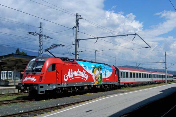 Die SZ 541 013 trägt nun eine neue Werbung von Almdudler. Am 1. Mai war sie in Villach zu sehen (Bild), nach dem sie am Vortag in Slowenien beklebt wurde.