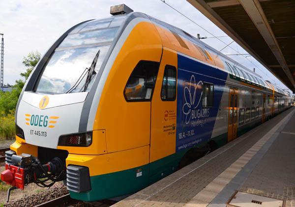 Zug der ODEG jetzt unterwegs im BUGA-DesignBUGA-KISS fährt für die Bundesgartenschau 2015 als Botschafter durch den Osten Deutschlands