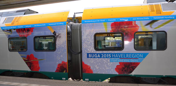 Bei der öffentlichen Vorstellung waren Erhard Skupch als Geschäftsführer des BUGA-Zweckverbandes sowie der Geschäftsführer der ODEG - Ostdeutsche Eisenbahn GmbH, Arnulf Schuchmann, zugegen. Mit dabei waren außerdem der Bürgermeister der BUGA-Kommune Rathenow (Ronald Seeger), der Amtsdirektor des BUGA-Amtes Rhinow (Jens Aasmann), Vertreter der BUGA-Hansestadt Havelberg (Petra Jonschkowski) und der BUGA-Stadt Premnitz (Carola Kapitza). ?Der BUGA-KISS wird von Wismar über Berlin bis nach Cottbus und Jüterbog als Botschafter im ODEG-Reisegebiet unterwegs sein und auf die BUGA 2015 aufmerksam machen?, erklärt Arnulf Schuchmann, Geschäftsführer und Sprecher der ODEG. ?Die BUGA 2015 ist ein Großereignis für die Havelregion. Wir freuen uns, ein Teil davon zu sein, denn mit den Linien RB51 und RE4 verbinden die Züge der ODEG drei Standorte der BUGA. Wir hoffen, mit unseren Zügen viele Fahrgäste in die BUGA-Region zu bringen und damit zum Erfolg der Bundesgartenschau beizutragen.? Ronald Seeger, Bürgermeister der Stadt Rathenow, führte aus: ?Ich freue mich sehr darüber, dass wir in der ODEG einen weiteren kompetenten Partner gefunden haben. Die Menschen, die diesen Zug sehen und die Botschaft von der Bundesgartenschau lesen, können sich 2015 von einer großartigen Gartenschau persönlich überzeugen. Am besten wäre es natürlich, wenn sie dann noch mit der ODEG anreisen.? ?Die ODEG ist ein wichtiger Partner für uns?, ergänzte Erhard Skupch. ?Gerade bei dieser BUGA ist die touristische Infrastruktur auf der Schiene von entscheidender Bedeutung, da sehr viele BUGA-Gäste zwischen den einzelnen BUGA-Standorten in der Havelregion wechseln. Die ODEG versorgt uns im kommenden Jahr mit einer sehr guten Personennahverbindung zwischen Brandenburg an der Havel und Rathenow. Dass nun auch ein BUGA-Zug der ODEG durch Mecklenburg-Vorpommern, Brandenburg und Berlin rollen wird, freut uns umso mehr. Dieser Zug ist eine wunderbare Werbung für unsere Gartenschau.? Die Buchstabenkombination KISS fasst den neuesten technischen Stand der Triebfahrzeug-Technologie zusammen und die Übersetzung lautet: Komfortabler, innovativer, spurstarker S-Bahn-Zug.