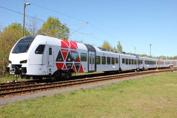 Die neuen Triebzüge sind erstmals nicht im typischen „DB Rot“ der Deutschen Bahn gestaltet, sondern in der Grundfarbe weiß lackiert und mit grauen und roten Elementen an den Triebfahrzeugköpfen versehen. Des Weiteren ist die Inneneinrichtung abweichend vom bisherigen DB Design gestaltet. Eine technische Besonderheit ist die Kuppelbarkeit der FLIRT-Züge mit den doppelstöckigen KISS-Zügen der CFL (Luxemburgische Staatsbahn): Erstmals werden Triebzüge unterschiedlichen Typs von zwei europäischen Staatsbahnen aneinandergekoppelt fahren. „Wir sind stolz darauf, dass zwei Staatsbahnen gekoppelt mit zwei unterschiedlichen Produkten aus unserem Hause zukünftig die Strecken Trier-Koblenz befahren werden“, sagt Michael Daum, Geschäftsführer der Stadler Pankow GmbH. „Der FLIRT der 3. Generation ist ein hochmodernes Schienenfahrzeug und bietet viel Komfort. Erstmals finden wir in der Ausführung für die DB Regio einen Mittelwagen ohne Tür, welcher den Fahrgästen einen komfortablen Ruhebereich ermöglicht. Die Zulassung für die Flirt³-Doppeltraktion liegt bereits vor.“ Die fünfteiligen Fahrzeuge sind in den Vis-à-vis-Sitzbereichen mit großen Tischen ausgestattet. Fahrgastbereiche und Fahrerraum sind klimatisiert. Eines der beiden behindertengerechten WCs ist auch für Elektrorollstühle geeignet, der Einstieg in den Zug ist barrierefrei. Jedes Fahrzeug bietet 249 Sitzplätze in der zweiten und 21 Sitzplätze in der ersten Klasse. Der FLIRT verfügt über eine hohe Antriebsleistung und erreicht eine maximale Geschwindigkeit von 160 km/h. Insgesamt wurden 28 Züge bei Stadler Pankow bestellt. „Für die Fahrzeuge vom Hersteller Stadler haben wir uns entschieden, da sie sowohl eine optimale Lösung für die Komfortansprüche unserer Kunden darstellen als auch die besonderen betrieblichen und technischen Rahmenbedingungen des RE-Netzes erreichen können,“ so Kay Euler, Vorstand Produktion Schiene der DB Regio AG. „Die Flirt-Fahrzeuge der neuesten Generation werden Kernstück des Rheinland-Pfalz-Taktes 2015 sein. Mit neuen Regional-Expresslinien, wie z.B. des RE 1 von Koblenz über Trier, Saarbrücken, Kaiserslautern nach Mannheim wird eine neue Qualität im schnellen Regionalverkehr geschaffen. Durch die Einbindung in die Knotenpunkte Koblenz, Trier und Kaiserslautern wirkten die Vorteile des neuen RE weit in die Fläche hinein, weil die Fahrzeiten der Regionalbahnen optimal mit den Fahrplänen des RE verknüpft werden konnten,“ so Michael Heilmann, Geschäftsführer des Zweckverbandes Schienenpersonennahverkehr Rheinland-Pfalz Süd. Quelle:/Fotos: Stadler Rail Group | |