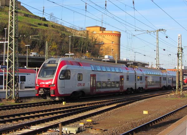 Ein neues Gesicht in KoblenzAb Planwechsel werden die CFL-Triebwagen der Bauart KISS von Stadler zwischen Luxemburg und Koblenz verkehren. Zwischen Trier und Koblenz laufen sie dabei gemeinsam mit den neuen Stadler Flirt von DB Regio. Schon jetzt besuchen einzelne Triebwagen zur Personalschulung den Rhein. Am 21.11.2014 machte beispielsweise der nagelneue CFL 2308 eine Probefahrt im Hbf Koblenz.