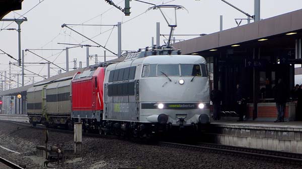 147 001 wird wieder einmal überführtAm 17. Februar 2015 konnte am Nachmittag gegen 17 Uhr in Göttingen dieses Gespann aus 103 222 (railadventure) und 147 001 auf Überführungsfahrt Richtung Norden beobachtet werden.