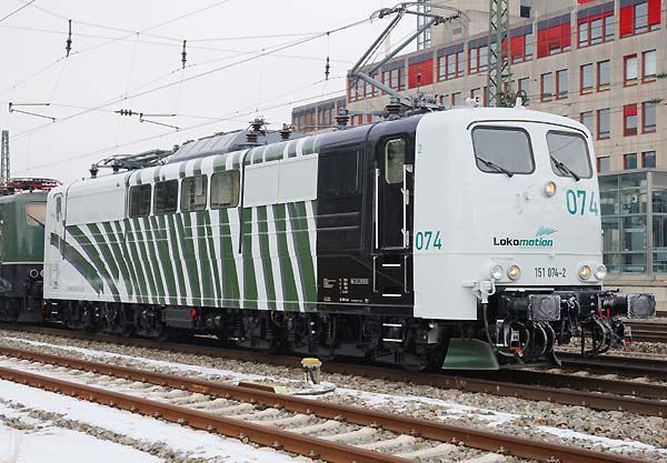 151 074: Ein neues Zebra im StallDie Zebraherde von Lokomotion wird immer bunter. Nach erfolgreicher HU ( 13.2.2015 ) ist die neueste Lokomotion-Lok 151 074 auf dem Weg von Dessau nach München-Ost, sie hat 151 124 dabei. Das Foto entstand am 17. Februar am Heimeranplatz.