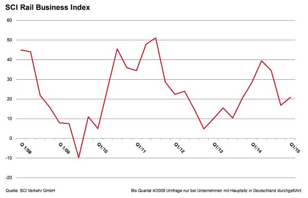 SCI Global Rail Index 1/2015Internationale Bahnbranche verspürt kurzfristige Erholung - die Aussichten auf 2015 sind aber getrübtDie Stimmung führender Unternehmen der weltweiten Bahnbranche, welche durch den SCI Global Rail Index erfasst wird, hat sich zu Beginn des Jahres 2015 leicht verbessert. Dies liegt vor allem an der gestiegenen Zufriedenheit mit der derzeitigen Geschäftslage und einer Stabilisierung der Nachfrage. Mehrere große Aufträge wie die vorläufige Vergabe von 82 Doppelstocktriebzügen für den Rhein-Ruhr-Express an Siemens, 37 Alstomfahrzeuge für die Verkehrsbetriebe Paris und 156 Metrowagen von CNR Changchun für die Stadt Lanzhou heben die Stimmung zu Jahresbeginn. Ob sich dieser Optimismus fortsetzt ist allerdings fraglich. Die Aussichten auf das kommende Halbjahr sind deutlich getrübt. Die internationale Bahnbranche erwartet 2015 ein schwieriges Jahr.