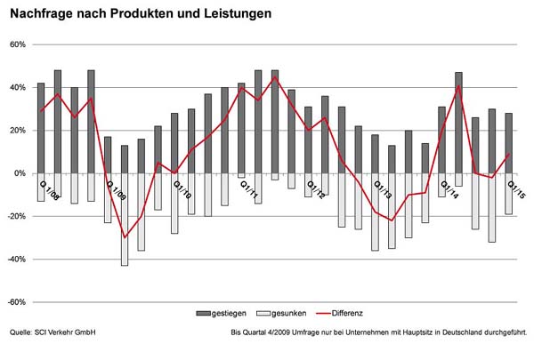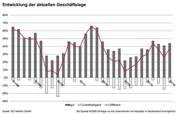 Die aktuelle Geschäftslage wird als etwas besser eingeschätzt als im vorherigen Quartal. Auffallend gut ist, dass nur 6% der Unternehmen ihre Geschäftslage als unbefriedigend ansehen. Grund sind gute Abschlüsse zu Jahresbeginn wie zum Beispiel Siemens Zuglieferungen für den Rhein-Ruhr-Express und eine stabile Auftragslage in China. Insgesamt entwickeln sich die wichtigen europäischen Märkte stark, dank Infrastrukturoffensiven und Fahrzeugbestellungen. Auch der US-Markt entwickelt sich gut. Einzig Russland leidet unter der schwächelnden Wirtschaft und dem Ukraine-Konflikt.