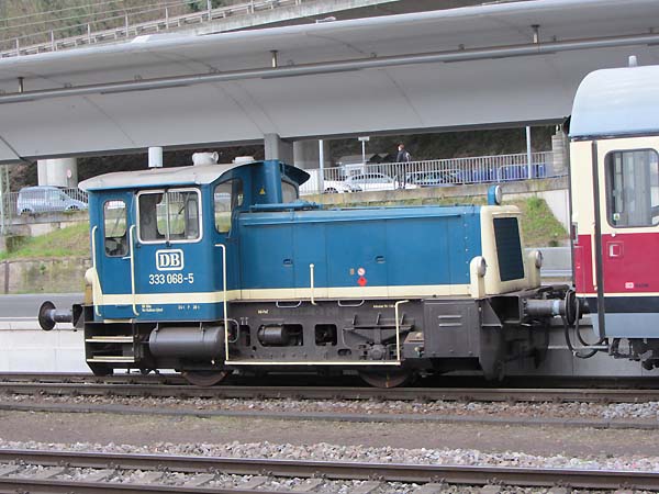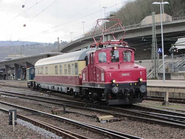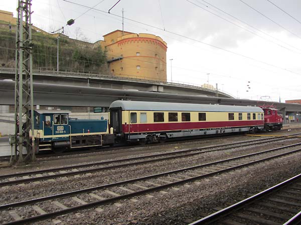 Klein aber fein...... war der Sonderzug, der am 27. März 2015 im Bahnhof Koblenz Hbf fotografiert wurde. Die E69 03 hatte dabei den Kanzlerwagen WGSmz 853.0 (61 80 89-90 001-2) am Haken. Unterstützt wurde sie von der ebenfalls dem DB Museum Koblenz gehörenden 333 068.Quelle:/Fotos: Joachim Kratz | |