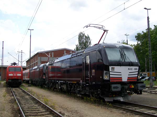 Vor Pfingsten trafen mit den 193 865, 874 und 879 die ersten drei Vectrons von MRCE zur Personalschulung in Nürnberg Rbf ein. Mit der Anmietung will DB Schenker einen bis zur Lieferung der Rehe 187 auftretetenden Lokengpass überbrücken. Weitere 193er sollen folgen. Das Bild zeigt die 193 865 und 879 am 26. Mai 2015 zur Schulung in Nürnberg RBF.