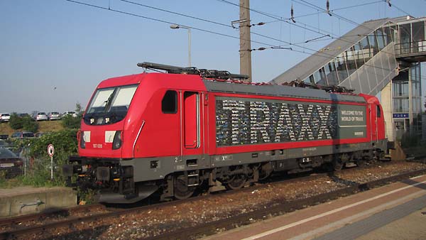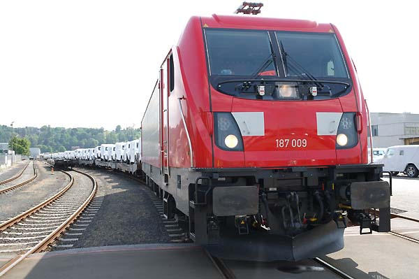 TRAXX AC Last Mile-Lokomotive: Mit voller Leistung durch ÖsterreichEinmal mehr hat die BOMBARDIER TRAXX AC Last Mile-Lokomotive 187-009 ihre Leistungsfähigkeit bewiesen: Bei Testfahrten in Österreich zog sie bis zu 2199 Tonnen schwere Güterzüge nur im Last Mile-Modus, befuhr Strecken mit engen Bogenradien und meisterte Steigungen bis zu 27 Promille.Die TRAXX AC Last Mile-Lokomotive war von Sonntag, 5. Juli, bis Donnerstag, 9. Juli, mit Zügen von LTE (Logistik- und Transport-GmbH) unterwegs. Unter anderem zog sie Waggons mit Autos (für die Weiterfahrt zum Bremerhavener Hafen) von der Grazer Zentrale des Unternehmens zum Autozustellplatz im Ortsteil Messendorf; der Zug hatte eine Gesamtlänge von 560 Metern. Sie rangierte einen Zug in eine Abstellgruppe der Graz- Köflacher Bahn; das funktionierte ohne Fahrdraht. Weitere Strecken führten über die Südostachse nach Wien. Hier transportierte die Lok unter anderem Hackschnitzel von Ebenfurt nach Gratwein - an der Spitze eines 2199 Tonnen schweren und 610 Meter langen Zugs. Der Transport führte über den Wiener Hausberg Semmering mit einer Passhöhe von 984 Metern und extrem engen Bogenradien. Laut Lasttafel sind hier Doppeltraktion und Schiebelok vorgeschrieben. Es konnte aber vollständig auf die Leistung der zweiten Lok an der Spitze des Zuges verzichtet werden, und auch die Schiebelok musste nur die Hälfte ihrer Leistung aufschalten, um die Geschwindigkeit zu halten.