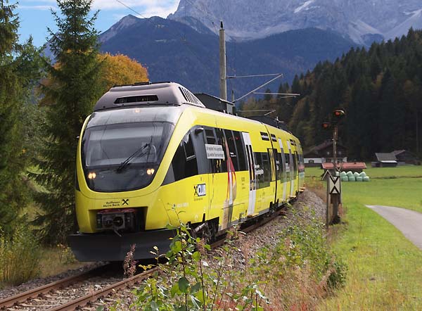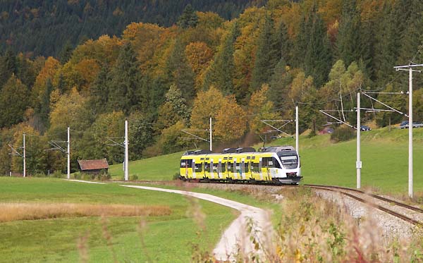 Neuer Werbe-Talent in Tirol unterwegsIm Wochenumlauf vom 05.10.2015 bis 10.10.2015 war der neue ÖBB Werbetalent auf der Mittenwaldbahn anzutreffen. 4024 088-9 trägt Werbung für die Raiffeisenbank. Außergewöhnlich ist, dass der Werbetalent nur auf einer Stirnseite das ÖBB Emblem trägt, auf der anderen Stirnseite trägt er das Raiffeisenlogo. Der Triebwagen ist auf der Relation Innsbruck - Mittenwald - Garmisch-Partenkirchen unterwegs und hat gerade den Bahnhof von Klais verlassen. Bahnstrecke 5504 München Hbf. - Mittenwald Grenze am 05.10.2015
