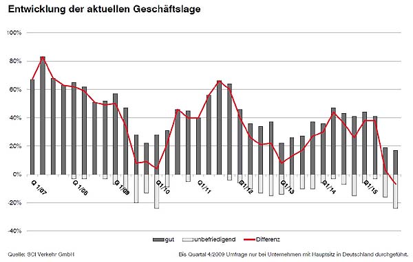 Die Beurteilung der aktuellen Geschäftslage verzeichnet seit Mitte des Jahres einen signifikanten Einbruch. Die aktuelle Geschäftslage ist mehrheitlich unbefriedigend. Im letzten Quartal 2015 ist nur noch eine Minderheit der befragten Unternehmen zufrieden mit ihrer aktuellen Geschäftslage: Nur noch 17% der Befragten bewerten ihre Lage als gut. Der Anteil der Unternehmen, die unzufrieden mit ihrer derzeitigen Lage sind, wächst im vierten Quartal 2015 auf etwa 24%. Mögliche Ursachen hierfür sind die weiter unten noch vertiefte rückläufige Nachfrage nach bahnindustriellen Produkten und Leistungen sowie die dadurch immer geringeren Auftragsbestände, die bis zuletzt einen, wenn auch verhalten, optimistischen Blick in die Zukunft erlaubten.