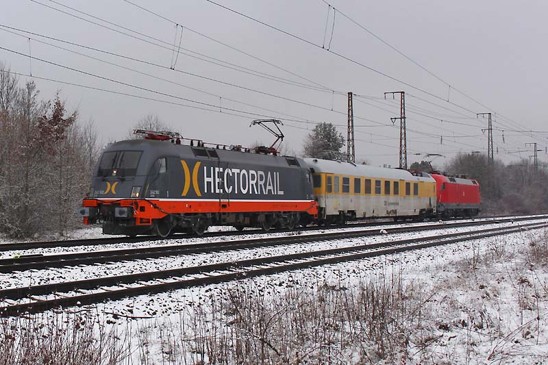 Oberleitungsmessfahrten mit zwei engen VerwandtenAm 8. März war dieses Gespann mit Oberleitungsmessfahrten von München nach Padborg beschäftigt. Die Hectorrail 242 502 beförderte den aus einem Meßwagen bestehenden ST 92861 zusammen mit 182 506 durch das leicht verschneite München-Daglfing auf dem Weg nach Flensburg. Auch wenn es nicht so aussieht so sind beide Loks doch nah verwandet und wurden ursprünglich als ES 64 U2-002 und 006 für Siemens Dispolok ausgeliefert. Beide wurden später verkauft - die 182 502 alias 242 502 an Hectorrail und die 182 506 an die DB Systemtechnik.
