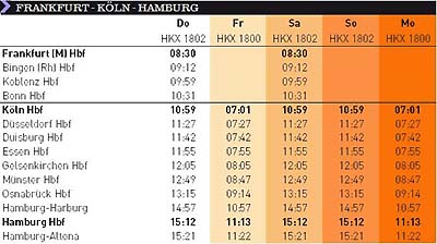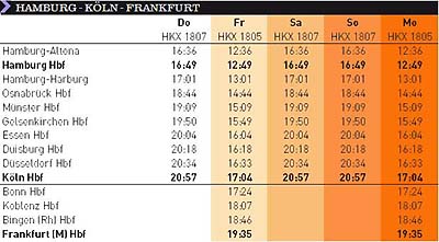 HKX weitet Fahrplan ausZüge verkehren ab 01. Mai 2016 wieder montags / Halte in Bingen, Koblenz und Bonn für NRW-Pendler interessant / zusätzliche Züge und mehr Wagen zu den FeiertagenAb dem 01. Mai verkehren die Züge des privatwirtschaftlichen Bahnunternehmens Hamburg-Köln-Express GmbH (HKX) auch wieder montags: Damit verkehren die HKX-Züge wieder an fünf Tagen der Woche, nämlich von Donnerstag bis Montag, regelmäßig zwischen Hamburg und Köln und zurück. Zudem startet der HKX 1802 am Donnerstag und Samstagmorgen um 8.30 Uhr in Frankfurt am Main Hauptbahnhof. Am Freitag und Montag fährt HKX 1805 aus Hamburg kommend um 17:04 ab Köln Hbf direkt weiter bis Frankfurt am Main. Die Züge verkehren jeweils mit Zwischenhalten in Bingen, Koblenz und Bonn. „Das macht den HKX 1805 auch für NRW-Pendler, die nach Bonn, Koblenz oder Bingen wollen, besonders interessant“, sagt HKX-Geschäftsführer Carsten Carstensen. „Mit dem HKX 1805 können sie abends diese Halte direkt erreichen. Entweder mit einem DB-Ticket oder zum günstigen HKX-Tarif.“ Ein HKX-Ticket von Bingen oder Koblenz nach Köln gibt es bereits ab 9 Euro, eine Fahrt zwischen Bonn und Koblenz schon ab 5 Euro. Ein HKX-Ticket für die Strecke von Frankfurt/Main bis Hamburg kostet ab 18 Euro. Bei zunehmender Nachfrage und Auslastung steigt der Preis. Darüber hinaus werden in den HKX-Zügen alle DB-Tickets (auch mit BahnCard und die BahnCard 100) sowie insbesondere auch die des überregionalen Nahverkehrs (nicht Verbund- und Ländertickets) anerkannt. Besonders lohnt sich ein solches DB-Ticket für Fahrgäste, die weiter als bis nach Bonn, Koblenz oder Bingen reisen wollen: So gibt es in Bonn gute Anschlüsse von und nach Siegburg, Troisdorf oder Niederkassel, in Bingen von und nach Trier oder Luxemburg und in Bingen von und nach Mainz oder entlang der Nahestrecke nach Kaiserslautern und Saarbrücken – auch mit Zügen des Nahverkehrs. „Zu den Feiertagen im Mai hat der HKX wieder zusätzliche Züge und mehr Wagen im Einsatz“, so Carstensen weiter. „Das gilt für die besonders nachgefragten Tage rund um Himmelfahrt und Pfingsten.“ Der Sonderfahrplan mit den genauen Abfahrtstagen und -zeiten ist zu finden auf der HKX-Website unter www.hkx.de/hkx-fahrplan/. HKX-Fahrplan ab 01. Mai 2016* Gültig ab 01.05.2016 *abweichender Fahrplan an einzelnen Tagen. Näheres auf www.HKX.de. Quelle:/Fotos: Hamburg-Köln-Express GmbH | |