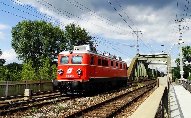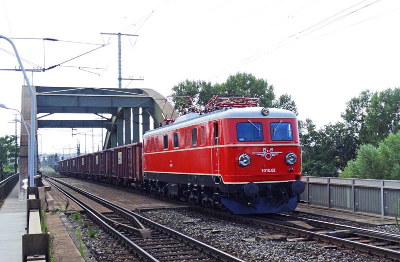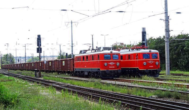 Ein nicht alltägliches ZusammentreffenZu einem nicht alltäglichen Zusammentreffen zweier altehrwürdiger 6-achsiger ehemaliger ÖBB-Lokomotiven kam es am 11.8.2016.Das österreichische EVU GCA (Grampet Cargo Austria) betreibt ja seit Anfang April 2016 einen Schlackenganzzug ab dem Bahnhof Moosbierbaum-Heiligeneich, welcher planmäßig mit der NLB(Verein neue Landesbahn)-Lok 1110.505 bespannt ist. Aktuell wird zu einer Deponie nach Neunkirchen NÖ gefahren, wo das Frachtgut auf LKW umgeschlagen wird. Der Leerzug fährt dann nachmittags wieder zu seinem Ausgangsbahnhof zurück. Am 11.8.2016 gab es bei dieser Rückfahrt aber als Besonderheit einen Triebfahrzeugwechsel im Bahnhof Wien Erdbergerlände. Die NLB 1110.505 wurde abgehängt und die ÖSEK (Österreichischer Straßenbahn- und Eisenbahnklub) 1010.02 führte den Zug nach Moosbierbaum-Heiligeneich weiter. Ankunft mit NLB 1110.505 und Abfahrt mit ÖSEK 1010.02 am 11.8.2016 in Wien Erdbergerlände(Österreich). Bei der NLB 1110.505 sind die Stirnseiten dieser Lok zu beachten - eine mit Flügelrad und eine mit dem sogenannten Pflatsch...
