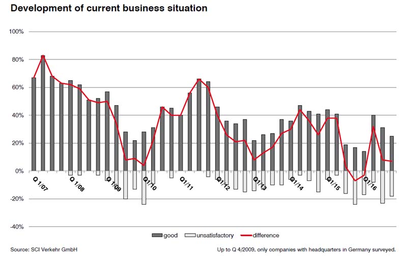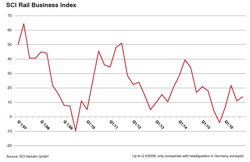 SCI Global Rail Index 4/2016 (engl.)Diese Ausgabe ist leider nur in der englischen Fassung verfügbar.International rail industry experiences short-term recovery – majority of companies expect positive start into 2017 At the end of the year 2016, the general atmosphere in the companies of the global rail industry has slightly improved. This is shown in the most recent SCI RAIL BUSINESS INDEX – a periodical survey among the global railway industry’s top managers by the consultancy firm SCI Verkehr. Main driver of the current optimism is the positive business situation expected for the upcoming six months. The current business situation, by contrast, has been evaluated as constant on a still positive, but moderate level of 7%. The demand for products and services has lost the recently gained momentum, however seems to be cushioned by a vast majority of the polled companies, reporting to be satisfied with the current order back lock. The industry’s ongoing consolidation pressure further sets on the decline in employment and establishes the companies’ strategic objectives for 2017. Compared to the previous quarter, polled top managers evaluate the current business situation to remain rather constant on a still positive, but moderate level of 7%. Assessment of the current business situation, remains highly heterogeneous. The shares of top managers assessing the business development as “good” as well as “unsatisfactory”, both have decreased by about 5%, hence resulting in a vast – and slightly increased – majority of the polled companies, declaring to be satisfied with the current business situation. The demand for products and services, as an important indicator for the industry’s development, has lost the recently gained momentum. In balance, however, 4% of the polled top managers report a positive development. At the end of the year 2016, assessments of the top managers are still heterogeneous. While more than a quarter of the respondents report a positive development, more than 20% complain about falling demand. Nevertheless, a vast majority of 56% of the polled companies still report to be satisfied with the current order back lock; in balance, 6% state to benefit from a relatively large order back lock. With regard to a vast majority of the polled companies reporting to be satisfied with the current order back lock, the current soft slowdown in demand is anything but alarming – but rather typical for the highly cyclical business of the rail industry. At the end of the year, the assessment of the employment situation has observed a significant slump. The spontaneous recovery of the last two quarters has not been sustainable, when suddenly falling back to the negative levels of the previous quarters. With a balance of -18% more companies reported to have reduced the number of employees than have increased it. With the companies remaining to be concerned by the decline in employment, the rail industry’s consolidation seems to be increasingly reflected. Starting in the last year, with the consolidation the industry’s overcapacities have been reduced successively in order to maintain international competitiveness. In particular the latter gains significant importance with regard to the companies’ objectives for 2017. SCI Verkehr also asked companies about their strategic objectives for the upcoming year. Location optimisation as well as regional expansion is seen by about 46% of the polled top managers as the most significant strategic objectives for 2017. M&A-activities are considered as another important objective for many businesses, followed by financial engineering and the strengthening of businesses besides rail. While a majority of 57% of the polled managers expect the current business development to stay unchanged, in balance 21% of the respondents look ahead with increasing confidence. Only 11% of the managers express cautious reservations regarding the development of the business development in the coming six months. “The industry has started to cope with the current uncertainties and challenges – in particular the industry’s digitalisation is progressing fast”, concludes Maria Leenen, CEO of SCI Verkehr GmbH with regard to the current optimism of the expected business development. Quelle:/Fotos: SCI Verkehr GmbH | |