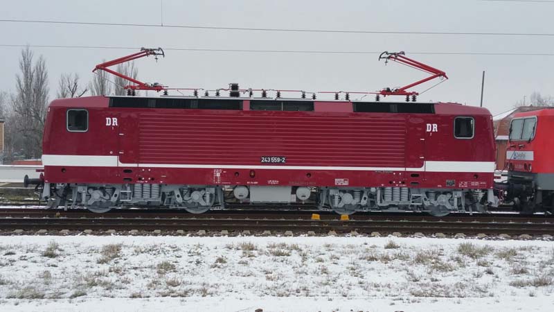 Die neue 243 559 von Delta Rail243 559 im DR Look am 18. Januar 2017 um 11:15 Uhr im Bf Frankfurt/Oder. Die Lok gehört nun der Firma Delta Rail. Sie ist aber nicht ganz korrekt Deutsche Reichsbahn - sie hat einen DSS 200 Stromabnehmer mit automatischer Senkeinrichtung. War wahrscheinlich vorgesehen zur Freigabe als 114.3.