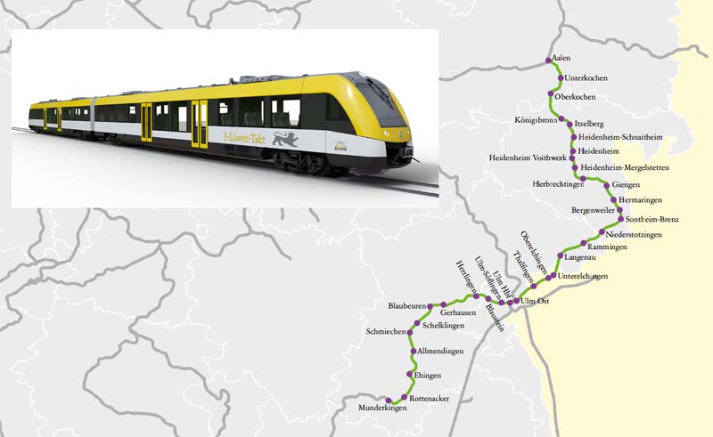 Hohenzollerische Landesbahn fährt künftig auf der Brenzbahn und im DonautalFahrgäste profitieren von Juni 2019 an von modernen Neufahrzeugen sowie weiteren Zügen am Wochenende und AbendsDas Ministerium für Verkehr Baden-Württemberg hat gestern (24.04.2017) zusammen mit der Bayerischen Eisenbahngesellschaft (BEG) den regionalen Bahnverkehr im sogenannten „Ulmer Stern“ (Vergabenetz 12) an die Hohenzollerische Landesbahn (HzL) vergeben. „Dies bedeutet vom Juni 2019 an neue und modernere Fahrzeuge sowie ein verbesserter Fahrplan“, sagte Verkehrsminister Winfried Hermann am 24. April in Stuttgart. „Es hat sich einmal mehr gezeigt, dass der Wettbewerb sowohl günstigere Preise für das Land als auch Verbesserungen für die Fahrgäste ermöglicht. Besonders freue ich mich darüber, dass sich diesmal eine Landesgesellschaft im Wettbewerb durchgesetzt hat.“ Mit der Neuvergabe an die HzL liegt der Preis pro Zugkilometer rund ein Fünftel unter dem bisherigen Preis des Großen Verkehrsvertrags. Die Inbetriebnahme des Netzes ist für Juni 2019 vorgesehen. Das Netz 12 umfasst den Regionalexpress (RE) Ulm-Aalen, die Regionalbahn (RB) Ulm-Langnau und die RB Ulm-Munderkingen. Nicht enthalten sind der Interregio Express (IRE) Ulm-Aalen und der IRE/RE Ulm-Sigmaringen-Donaueschingen. Diese Leistungen wurden bereits im Netz 5 an die DB vergeben. Im Netz 12 wird grundsätzlich das heutige Angebot weitergefahren. Verbesserungen wird es in den Tagesrandlagen und am Wochenende geben. Dort werden Taktlücken geschlossen. Insbesondere wird das Angebot in den Abendstunden verbessert: Ab Ulm geht es von Juni 2019 an stündlich bis 22.14 nach Aalen und um 23.14 Uhr nach Heidenheim sowie ab Aalen stündlich bis 22.34 Uhr nach Ulm und um 23.34 Uhr mit IRE-Anschluss von Karlsruhe nach Heidenheim. Ab Langenau verkehrt künftig sonntags von 6.26 Uhr an eine zusätzliche Regionalbahn nach Ulm. Täglich fährt um 20.30 Uhr ein zusätzlicher Zug von Ulm nach Langenau. Der vor einigen Jahren wieder in Betrieb genommene Bahnhalt Rottenacker wird künftig stündlich bedient, auch an den Wochenenden. Der heutige RE Ulm-Aalen-Crailsheim wird mit Dieselantrieb nur noch bis Aalen fahren. Dort besteht aber Anschluss von und zur elektrisch betriebenen Metropolexpress-Linie Stuttgart-Aalen-Crailsheim. Insgesamt wird das Angebot im Netz 12 im Vergleich zu heute um rund 16 Prozent auf künftig ca. 1,7 Millionen Zugkilometer pro Jahr ausgeweitet. Davon entfallen knapp 200.000 Zugkilometer auf den rund 8 Kilometer langen bayerischen Abschnitt der Brenzbahn. Dort halten die Züge an den drei bayerischen Verkehrsstationen Thalfingen (RE, RB), Oberelchingen (RB) und Unterelchingen (RB). Die HzL wird moderne, neue Dieseltriebwagen des Typs LINT 54 des Herstellers Alstom einsetzen. Dieser Fahrzeugtyp wird damit erstmals in Baden-Württemberg eingesetzt. In vielen anderen Bundesländern hat er seine Praxistauglichkeit schon unter Beweis gestellt. Die Fahrzeuge werden eine Einstiegshöhe von 55 Zentimetern haben. Damit ist an den meisten Stationen der Brenz- und Donautalbahn im Unterschied zu den heute eingesetzten Fahrzeugen ein barrierefreier Einstieg möglich. Außerdem werden in jedem Fahrzeug 18 Fahrradstellplätze vorhanden sein.