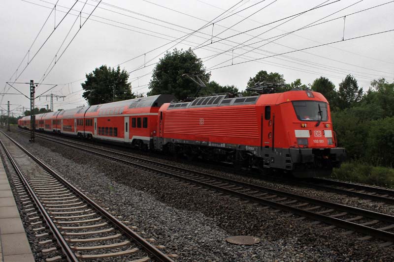 Großer Messfahrten-Tag im Münchner WestenGleich mehrere Messfahrten waren am 24. Juli im Münchner Westen unterwegs: Die neue MNE-Garnitur (München-Nürnberg-Express) auf Zulassungsfahrt im Sandwich bespannt mit 102 001 und 102 002 - augenommen in München-Langwied