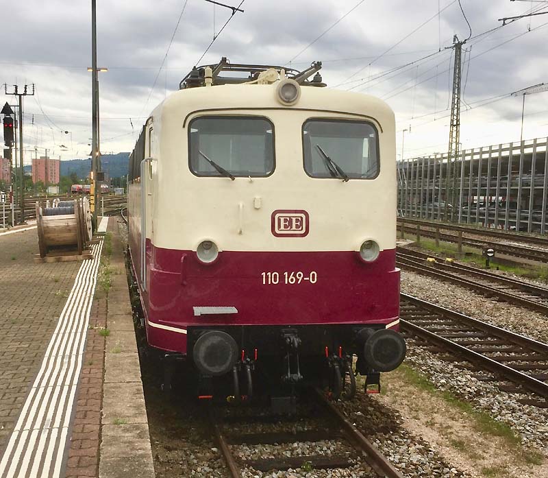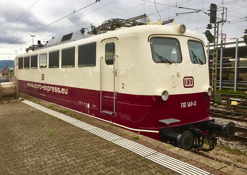 Die neue 110 169Am 27.07.2017 stand die EE 91 80 6 110 169-0 am Gleisstutzen zum Bahnsteig-Gleis 2 in Basel Badischer Bahnhof. Die Lok macht einen erstklassig gepflegten Eindruck. Allerdings ist sie sehr spärlich Beschriftet, es findet sich nach wie vor keine Eigentümer-Kennung, ausser der Web-Adresse www.euro-express.eu
