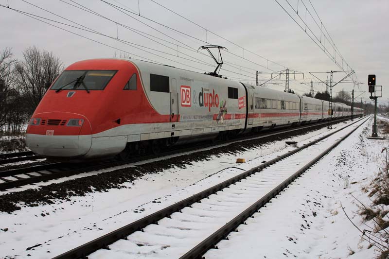 Die wahrscheinlich schnellste Praline auf deutscher SchieneDie wahrscheinlich schnellste Praline auf deutscher Schiene, der ICE-1 401 512 war bei starken Nieselregen am 22. Januar 2018 in München-Langwied zu sehen, als er als ICE593 aus Berlin eintraf.