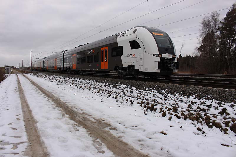 RRX-Testfahrten im SüdenDie ersten Züge der Bauart Desiro HC für den künftigen Rhein-Ruhr-Express befinden sich derzeit in Erprobung und sind bei Testfahrten auch weit abseits des künftigen Einsatzgebietes unterwegs. Am 24.01.2018 war die Garnitur 462 004 zwischen Haspelmoor und Hattenhofen auf dem Weg zum FTZ-München (Heiner Prochazka).