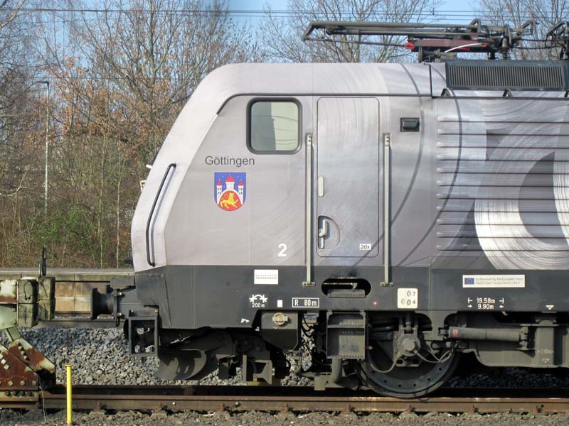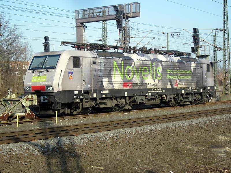 Alu auf der Schiene zwischen Sierre und Göttingen Die neuen Novalis-Werbeloks. (Markus Pfetzing) Zwei Loks des Typs Siemens F4 ziehen seit Mitte Juni 2017 für Novelis täglich Aluminium-Walzerzeugnisse zwischen Göttingen und Sierre in der Schweiz hin und her. Aus diesem Grund wurden die Siemens-Loks getauft - eine davon auf den Namen „Göttingen“ ES 64 F4-090 (9180 6189 990-5 D-DISPO Class 189-VE). Sie stehen für die gute Zusammenarbeit zwischen SBB Cargo, Novelis und VTG Rail Logistic. Aufgenommen am 20. Februar 2018 in Göttingen