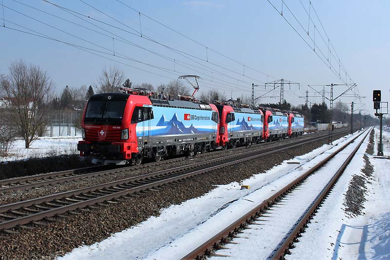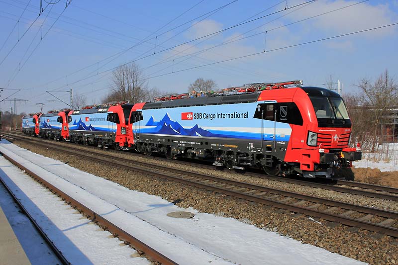 Vier neue Vectrons für SBB Cargo InternationalAm 28. Februar 2018 gab es eine wieder eine Lieferung für SBB-Cargo: Vier Vectrons auf dem Weg in die neue Heimat: In der Reihe 193 469 Simplon, 193 472 Köln, 193 470 Freiburg, 193 471 Karlsruhe, aufgenommen bei München-Langwied.