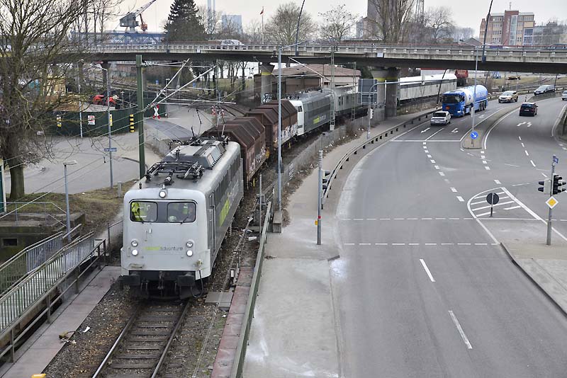 Railadventure zu Besuch im Karlsruher HafenNachdem die Railadventure 139 558-1 am 01.03.2018 wieder einen neuen Stadtbahntriebzug in den KVV-Betriebshof West geschoben hat, setzt sie nun im nördlichen Karlsruher Hafen um.