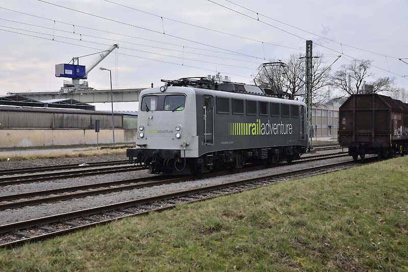 Nach getaner Arbeit verläßt die 139 558-1 am 01.03.2018 wieder den Karlsruher Hafen mit ihrem bunten Park. Er besteht aus den ehemaligen Bahnpostwagen mit der Spezialkupplung, den Bremswagen und der 103 222-6, natürlich ebenfalls eine Railadventure-Lok.