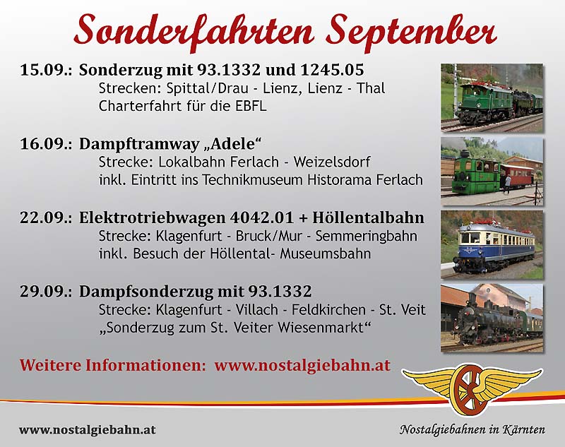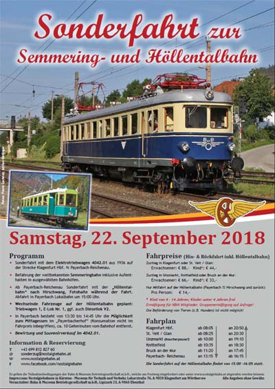 Am Samstag, dem 22. September 2018 führt der Verein Nostalgiebahnen in Kärnten eine ganz besondere Sonderfahrt durch. Wir würden uns freuen, wenn Sie an dieser teilnehmen würden oder wenn Sie diese E-Mail auch an Bekannte weiterleiten könnten!Zum Einsatz kommt der stilvolle Elektroschnelltriebwagen 4042.01 aus 1936, der ursprünglich für den hochwertigen Städte-Schnellverkehr gebaut wurde. Er befährt von Klagenfurt Hbf. ausgehend die Strecke über den Neumarkter Sattel sowie die Semmeringbahn. Zustiegshalte werden unterwegs in St. Veit an der Glan, Unzmarkt, Knittelfeld und Bruck an der Mur eingelegt. Während der Befahrung der weltbekannten Semmeringbahn werden sowohl bei der Hin- als auch Rückfahrt einige Halte in unterschiedlichen Bahnhöfen eingelegt. Ziel der Reise ist Payerbach-Reichenau. In Payerbach gibt es die Möglichkeit, gemeinsam beim Payerbacher Hof Mittag zu Essen (Konsumation nicht im Fahrkartenpreis inkludiert). Im Anschluss folgt ein kurzer Fußmarsch zur Abfahrtsstelle der Höllentalbahn, einer schmalspurigen elektrifizierten Museumsbahn. Mit den Garnituren der Höllentalbahn befahren wir die Gesamtstrecke bis nach Hirschwang. Es sind hier einige Fotohalte (auch außerhalb von Bahnhöfen!) vorgesehen. Je nach Anzahl der Fahrtteilnehmer werden unterschiedliche Fahrzeuge eingesetzt. Sollten sich nur wenige Fahrgäste zu unserer Fahrt angemeldet haben, kommen Triebwagen 1 mit Beiwagen 21 zum Einsatz. Sollte es die Einnahmensituation ermöglichen kommt auch auf einem Teilabschnitt die Elektrolok 1 Fahrendes Gartenhaus aus 1903 mit zwei Beiwagen zum Einsatz. Die E-Lok hat Kärnten Bezug - sie wurde für den Bau des Karawanken- Eisenbahntunnels zwischen Rosenbach und Jesenice beschafft und kam während der Bauzeit dort zum Einsatz. Wissenswertes: Anmeldung und Information: Im Internet unter http://www.nostalgiebahn.at/sonderzug-semmeringbahn.html Per Mail unter sonderzug@nostalgiebahn.at Per Telefon unter 0699 / 812 827 60 (Abends!) Wir freuen uns, Sie bei unserer Sonderfahrt begrüßen zu dürfen. Wir bitten um rechtzeitige Anmeldung, da bei zu wenigen Teilnehmern die Fahrt nicht stattfinden kann! Als Zeichen Ihrer Wertschätzung unseres ehrenamtlichen Engagements bedanken wir uns auch für die Weiterleitung dieser Mail an Bekannte und Freunde.