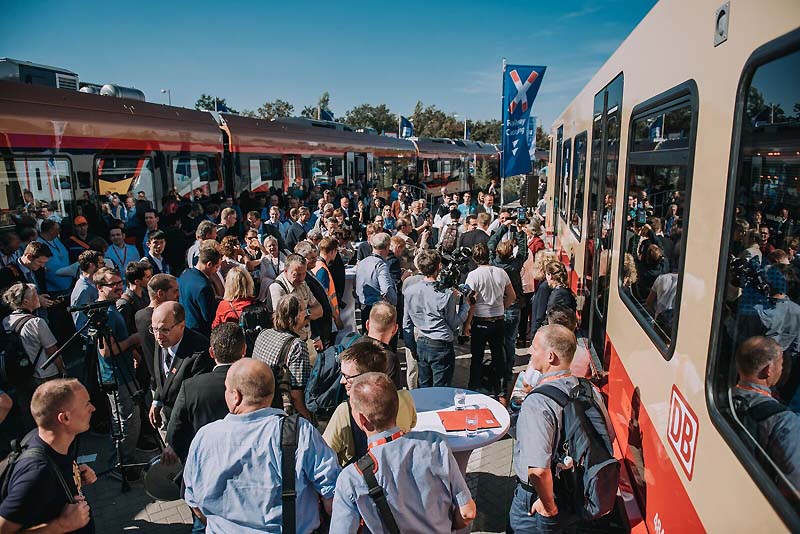Das Herstellerkonsortium aus Stadler und Siemens und die S-Bahn Berlin haben am 18. September 2018 auf der Innotrans, der internationalen Leitmesse für Verkehrstechnik in Berlin, den ersten Halbzug der neuen S-Bahn für die deutsche Hauptstadt vorgestellt. Das vierteilige Fahrzeug wird ab 2021 auf dem Teilnetz Ring/Südost verkehren. Während der Innotrans kann der Zug vom 18. – 23. September genau unter die Lupe genommen werden. Das Fahrzeug ist auch während der Publikumstage geöffnet, so dass Berlinerinnen und Berliner sich selbst einen ersten Eindruck von „ihrer“ neuen S-Bahn machen können. Dabei ist sie selbst eine waschechte Berlinerin: Entworfen, entwickelt und hergestellt von zwei tief in der Hauptstadt verwurzelten Unternehmen, sind die 106 neuen Züge genau auf die Bedürfnisse Berlins zugeschnitten. Während der Präsentation enthüllte Peter Buchner, Vorsitzender der Geschäftsführung der S-Bahn Berlin, gemeinsam mit dem Chef der Senatskanzlei, Christian Gaebler, und Susanne Henckel, Geschäftsführerin des Verkehrsverbunds Berlin-Brandenburg (VBB), die Logos der S-Bahn und des VBB. „Die Vorfreude steigt mit jedem Schritt, den der Zug seinem Fahrgasteinsatz näherkommt. Diese Vorfreude können wir nun mit den Berlinern und Brandenburgern teilen, die in dieser Woche ihre neue S-Bahn endlich live erleben können“, sagt Peter Buchner. Man erkennt die „Neue“ auf den ersten Blick an der typisch gelb-roten Farbgebung. Dennoch ist einiges anders: Die modern gestaltete Front der Züge, hinter der die Bedienelemente in der Fahrerkabine nach aktuellen ergonomischen Erkenntnissen angeordnet sind, ebenso wie die Integration sämtlicher Bildschirme in das Fahrerpult, was dem Fahrer eine deutlich bessere Sicht auf die Strecke ermöglicht. Im Innenraum kommen ebenfalls neueste Gestaltungsmodelle zum Tragen: Der 73,6 Meter lange vierteilige Halbzug mit 184 Sitzplätzen ist komplett durchgängig und ermöglicht so eine optimierte Fahrgastverteilung. Erstmalig ist die neue S-Bahn-Baureihe für Berlin mit einer Klimaanlage ausgestattet. Aufgrund der durch das Berliner S-Bahn-Netz vorgegebenen Fahrzeughöhe wurde eine besondere Lösung für das Einbringen der entsprechenden Komponenten projektiert. Während ein Teil der Klimaanlage im Bereich über den Sitzgruppen in der Fahrzeugdecke eingelassen ist, befinden sich weitere Bauteile der Anlage unter dem Fahrzeugboden. Das neue Fahrgastinformationssystem beinhaltet u.a. eine Flachbildschirm-Anzeige auf jeder Wagenseite, welche die Inhalte dank einer hohen Auflösung gestochen scharf anzeigt und die Fahrgäste über den Streckenverlauf informiert. Auch außen ist auf einer LED-Anzeige seitlich vom Bahnsteig aus erkennbar, welche Linie am Gleis steht und wohin sie fährt. Konsortialführer Stadler übernimmt neben Design und Entwicklung der neuen Fahrzeug-Baureihe den mechanischen und wagenbaulichen Teil der Konstruktion und Fahrzeugproduktion. Darunter fallen beispielsweise die Klimatisierung, Türen, Wagenkasten und die Montage aller Komponenten. Siemens verantwortet den elektrischen Anteil. Dies umfasst das Antriebs- und Bremssystem, die Bordnetzversorgung, Fahrzeugsteuerung, Zugsicherungs- und Fahrgastinformationssystem sowie die Drehgestelle. Die neuen Fahrzeuge werden ab 2021 auf dem Berliner Teilnetz Ring/Südost eingesetzt. Die Vorserienproduktion umfasst fünf Halb- sowie fünf Viertelzüge, welche 2020 ausgeliefert werden, um ab Januar 2021 auf der Linie S 8 (Spindlersfeld- Südkreuz) in Betrieb zu gehen. Die weiteren 96 Züge werden bis Ende 2023 auf der Ringbahn (S41, S42) sowie auf den Linien S45, S46 und S47 im Fahrgastbetrieb fahren. Das Projekt „Neue S-Bahn für Berlin und Brandenburg“ liegt damit weiter im Zeitplan. Ulf Braker, CEO Stadler Pankow GmbH: „Der 2015 mit der S-Bahn Berlin geschlossene Vertrag stellt für Stadler einen wesentlichen Meilenstein für unsere Aktivitäten in Deutschland und vor allem in Berlin dar. Wie bei allen unseren Projekten verfolgen wir auch hier höchste Ansprüche an die Qualität unserer Arbeit. Als in Berlin produzierendes Unternehmen sind wir natürlich besonders stolz, heute die erste neue S-Bahn aus Berlin für Berlin vorstellen zu dürfen. Wir haben hier unsere Erfahrungen im Bereich von exakt auf die Kundenbedürfnisse zugeschnittenen Tailor-Made-Fahrzeugen mit eben diesen hohen Qualitätsansprüchen für die Fahrgäste der deutschen Hauptstadt verbunden.“ Sabrina Soussan, CEO Siemens Mobility GmbH: „Wir sind stolz darauf, erneut einen wichtigen Beitrag für die Mobilität der Stadt zu leisten, in der unser Unternehmen vor über 170 Jahren gegründet wurde. Die neue S-Bahn für Berlin vereint Tradition und High-Tech, und unter der fast hundertjährigen Farbkombination gelb-rot schlägt ein junges Herz. Mit einer hohen Redundanz der Antriebsanlage, modernster Bordnetzversorgung sowie zuverlässiger Fahrzeugsteuerung und Zugsicherung ermöglichen wir der S-Bahn Berlin einen reibungslosen Betrieb.“ Der Zug steht auf dem Außengelände der Messe Berlin, Gleis 10/400.