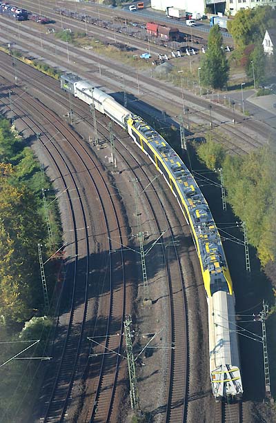 Am 10. Oktober 2018 war die 111 210 mit der Überführung des Go-Ahead-Flirts 94 80 1430 546-0 D-GABW beauftragt. Aus ungewohnter Perspektive wurde die Fuhre in Düsseldorf-Hamm aufgenommen. Quelle:/Fotos: Markus Tigges | |