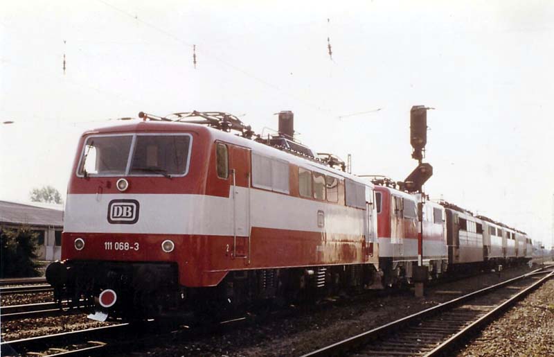 Am 14. Februar 2019 fand die 111 069 beim Bender ihr Ende. Es war eine der beidne Farbversuchsloks des AW München-Freimann. Die ersten Farbversuche waren schon 1985. Die Aufnahme zeigt die führende 111 068 zusammen mit der 111 069 an zweiter Stelle am Nordring in der Nähe des AW Freimann im September 1985 bei der wohl ersten Ausfahrt.