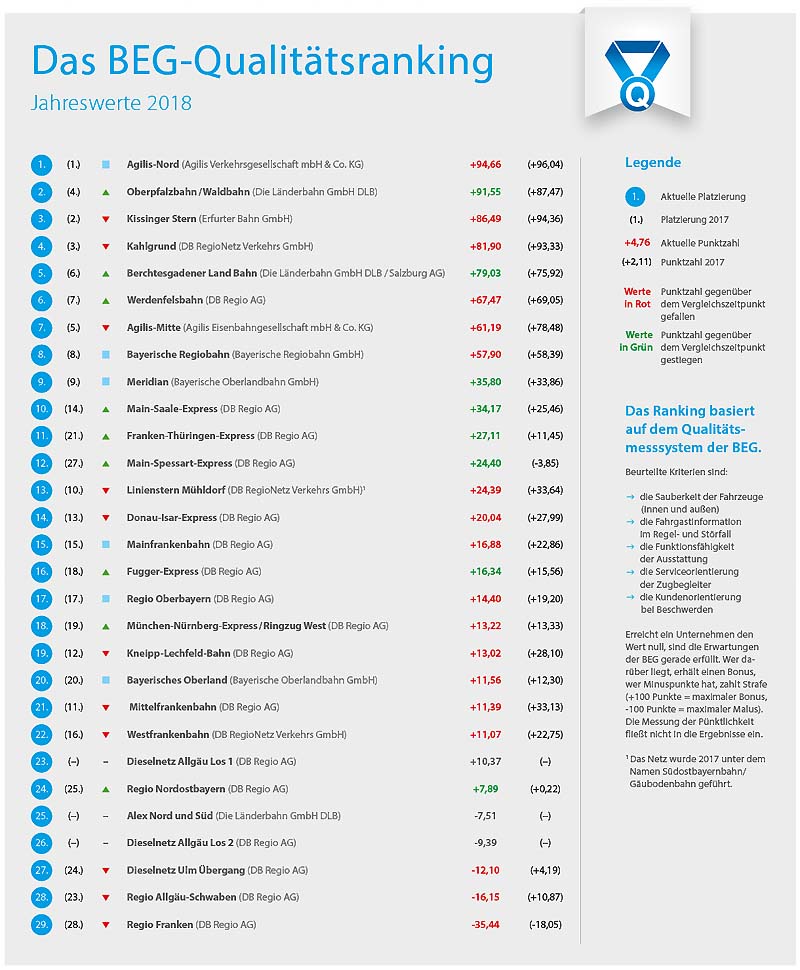 BEG-Qualitätsranking 2018: Bayerischer Regionalverkehr nach wie vor auf hohem NiveauDie bayerischen Regionalzüge konnten auch 2018 in Sachen Qualität gut punkten, landen im Schnitt aber etwas unterhalb des Spitzenwerts aus dem Jahr 2017. Das zeigt das jährliche Qualitätsranking der Bayerischen Eisenbahngesellschaft (BEG), die den Regional- und S-Bahn-Verkehr in Bayern im Auftrag des Freistaats plant, finanziert und kontrolliert: www.beg-qualitaetsranking.de. Im Berichtsjahr wurden 29 bayerische Netze im Qualitätsranking erfasst. Sie erzielten auf einer Skala von -100 bis +100 Punkten im bayernweiten Durchschnitt 28,68 Punkte. Zwar wurde damit die Rekordmarke vom Vorjahr verfehlt (Jahresranking 2017: 34,14 Punkte), der Wert entspricht allerdings der zweitbesten Durchschnitts-punktzahl seit Einführung des Qualitätsmesssystems im Jahr 2008. 24 von 29 Netzen übertrafen im Jahresranking 2018 die Mindestanforderungen der BEG in Sachen Qualität. Spitzenreiter bleibt das Netz Agilis-Nord, das auf sehr hohem Niveau punktet. Im Rahmen ihres Qualitätsmesssystems beurteilt die BEG unter anderem Qualitätskriterien wie die Sauberkeit der Züge, die Fahrgastinformation und die Serviceorientierung der Eisenbahnverkehrsunternehmen, die in ihrem Auftrag die Netze in Bayern betreiben. Die Pünktlichkeitswerte fließen nicht in die Ergebnisse des Qualitätsrankings ein. Sie werden in einem gesonderten Messsystem erfasst und später im Jahr veröffentlicht. „Mehr als drei Viertel der bewerteten Netze erreichen annehmbare Resultate, die unsere Mindestanforderungen übererfüllen. Das ist zunächst ein positives Signal an die Fahrgäste, die zu Recht ein hochwertiges Angebot auf Bayerns Schienen erwarten. Es gibt aber auch noch Luft nach oben. Die Eisenbahnverkehrsunternehmen müssen jede Stellschraube nutzen, um noch besser zu werden und das Qualitätsniveau im bayerischen Regionalverkehr nicht nur zu halten, sondern kontinuierlich weiter anzuheben. Das liegt im ureigenen Interesse der Unternehmen, nicht zuletzt weil unser Anreizsystem überdurchschnittliche Leistungen mit Bonuszahlungen belohnt und Strafzahlungen fordert, wenn unsere Erwartungen nicht erfüllt werden“, sagt BEG-Geschäftsführer Thomas Prechtl. Netz Agilis-Nord zum siebten Mal in Folge auf Platz 1 24 von 29 Netzen haben 2018 die Mindesterwartungen der BEG erfüllt und landen im Bonus-Bereich der Tabelle (2017: 25 von 28). Die Top 8 Netze tauschen im Vergleich zum Vorjahr teilweise die Plätze, jedes einzelne Netz erreicht aber erneut sehr gute Werte von mehr als 50 von 100 möglichen Punkten. An der Spitze steht – bereits zum siebten Mal in Folge – das Netz Agilis-Nord. Mit 94,66 Punkten (2017: 96,04 Punkte) landet das Netz knapp vor dem Netz Oberpfalzbahn/Waldbahn, das rund vier Punkte gegenüber dem Vorjahr gut machen und sich mit 91,55 Punkten Platz 2 sichern konnte (2017: 87,47 Punkte, Platz 4). 86,49 Punkte bringen das Netz Kissinger Stern auf Platz 3 (2017: 94,36 Punkte, Platz 2). Den größten Sprung nach vorne machte das Netz Main-Spessart-Express: Es verbesserte sich um 28,25 auf +24,40 Punkte. Das Netz belegt jetzt Platz 12 und stieg damit 15 Plätze im Jahresranking auf. Im Vorjahr hatte der Main-Spessart-Express mit -3,85 Punkten noch knapp die Mindestanforderungen der BEG verfehlt und musste sich auf Platz 27 der Tabelle einreihen. Auf Platz 11 hat es das Netz Franken-Thüringen-Express geschafft, das mit 27,11 Punkten bewertet wurde. Im Vorjahr belegte das Netz mit 11,45 Punkten noch Platz 21. Beide Netze erhielten u. a. bei den Qualitätskriterien „Fahrgastinformation im Regelfall“ und „Sauberkeit“ deutlich bessere Bewertungen als im Vorjahr. Qualitätspotenzial nicht abgerufen Der Mittelfrankenbahn machte insbesondere das Thema „Fahrgastinformation“ zu schaffen. Im Ergebnis musste das Netz 21,74 Punkte abgeben und landete mit 11,39 erreichten Punkten nur noch auf Platz 21 (2017: 33,13 Punkte, Platz 11). Im Netz Regio Allgäu-Schwaben fiel der Punkteverlust noch deutlicher aus: Es wurde um 27,02 Punkte schlechter bewertet als im Vorjahr. Mit -16,15 Punkten musste das Netz den Bonus-Bereich verlassen; es besetzt jetzt Platz 28 (2017: 10,87 Punkte, Platz 23). Häufig bemängelt wurden die Kriterien „Fahrgastinformation im Zug“, „Funktionsfähigkeit der Ausstattung“ und „Sauberkeit“. Das Netz Regio Franken konnte die positive Entwicklung im Vorjahr nicht nachhalten. Nachdem es 2017 noch mehr als 20 Punkte gegenüber 2016 zulegen konnte, musste es im Berichtsjahr wieder 17,39 Punkte abgeben. Es belegt mit -35,44 erzielten Punkten weiterhin den letzten Platz in der Tabelle (2017: -18,05 Punkte, Platz 28). Zwei Netze wurden 2018 im Qualitätsranking erstmals erfasst: Das Dieselnetz Allgäu Los 1 konnte die Mindestanforderungen der BEG in Sachen Qualität erfüllen; mit 10,37 Punkten reiht sich das Netz auf Platz 23 ein. Das Dieselnetz Allgäu Los 2 hat mit -9,39 Punkten den Bonusbereich verfehlt, es landet auf Platz 26. Mit -7,51 Punkten und auf Platz 25 bleibt auch das Netz Alex Nord und Süd unter den Erwartungen der BEG. Die bisher getrennt geführten Netze Alex-Nord und Alex-Süd wurden 2018 unter dieser neuen Bezeichnung im Zuge einer neuen vertraglichen Vereinbarung mit der Länderbahn zusammengefasst, so dass hier kein direkter Vergleich zum Vorjahr möglich ist. Qualitätsmesssystem als Grundlage Die bayerischen Regionalzüge werden nach einheitlichen Kriterien im BEG-Qualitätsmesssystem erfasst. Es bildet die Grundlage für das Qualitätsranking. Berücksichtigt werden die Sauberkeit der Fahrzeuge, die Fahrgastinformation, die Funktionsfähigkeit der Ausstattung, die Serviceorientierung der Zugbegleiter und die Kundenorientierung bei Beschwerden. Die Pünktlichkeit fließt nicht in die Ergebnisse ein, sondern wird in einem separaten Messsystem erfasst. Die BEG bewertet die einzelnen Netze mit Hilfe von externen Testern und Fahrgastbefragungen. Die Ergebnisse des Qualitätsranking
