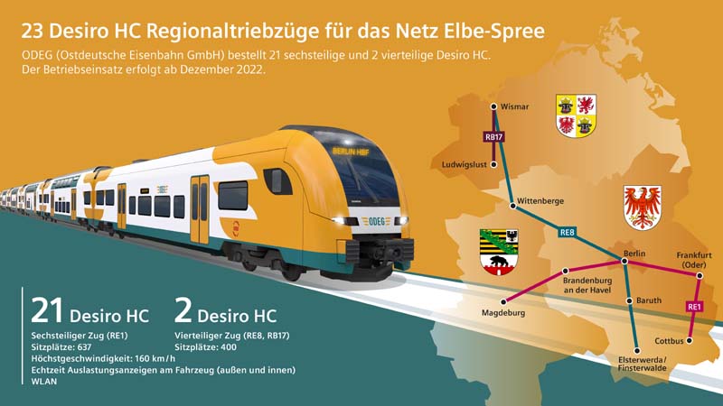 Die Ostdeutsche Eisenbahn GmbH (ODEG) hat bei Siemens Mobility 23 Regionalzüge vom Typ Desiro HC für den Einsatz im Netz Elbe-Spree bestellt. Der Auftragswert beläuft sich auf über 300 Millionen Euro. Die Triebzüge sind für den Einsatz auf den Regionalbahnlinien RE1, RE8 und RB17 im neuen Streckennetz Elbe-Spree vorgesehen. Die ODEG hatte im Januar 2019 den Zuschlag als Betreiber dieser Linien im Rahmen einer europaweiten Ausschreibung durch den Verkehrsverbund Berlin-Brandenburg (VBB) erhalten. Der Vertrag beinhaltet die Option auf Kapazitätserweiterung der RE1-Züge nach Verlängerung der Bahnsteige auf dieser Verbindung. Die Auslieferung der 21 sechs- und zwei vierteiligen Züge soll ab Sommer 2022 beginnen. Die Betriebsaufnahme ist für den Fahrplanwechsel im Dezember 2022 geplant. Die Produktion erfolgt im Siemens-Mobility-Werk in Krefeld. „Wir haben bereits mit der Umsetzung unseres Betriebskonzeptes Netz Elbe-Spree begonnen. Neben dem Ausbau der Werkstatt und unseres Ausbildungsbereiches sind die Fahrzeuge ein sehr wichtiger Part. Fahrzeuge, die allen Anforderungen des Verkehrsvertrages entsprechen und sich im laufenden Betrieb bewähren müssen. Hier setzen wir auf Siemens Mobility als starken Partner und gehen von einer rechtzeitigen und professionellen Herstellung bis zum Betriebsstart sowie einer sehr guten Zusammenarbeit aus“, sagte Arnulf Schuchmann, Geschäftsführer und Sprecher der ODEG. „Siemens wurde in Berlin gegründet; Berlin ist auch heute einer der beiden Hauptsitze von Siemens. Wir sind daher der Region Berlin-Brandenburg traditionell sehr verbunden. Allein die Mobilitätssparte beschäftigt 1.100 Mitarbeiter in der Hauptstadt. Viele dieser Kollegen pendeln aus der umliegenden Region zu ihrem Arbeitsplatz und werden dafür ab 2022 Siemens-Züge nutzen können“, sagte Sabrina Soussan, CEO von Siemens Mobility. Der VBB startete im November 2017 im Auftrag der Bundesländer Brandenburg, Berlin, Mecklenburg-Vorpommern und Sachsen-Anhalt das europaweite Vergabeverfahren des Netzes Elbe-Spree (NES). Mit jährlich rund 27 Millionen Zugkilometern ist es das größte Eisenbahnnetz in Deutschland, das bislang im Schienenpersonennahverkehr (SPNV) ausgeschrieben wurde. Das Vergabenetz umfasst 17 Regionalexpress- und Regionalbahnlinien sowie den Flughafenexpress (FEX). Die zu vergebenden Verkehrsleistungen wurden in vier Lose aufgeteilt. Los 1 und Los 4 wurden an die ODEG vergeben. Eingesetzt werden die sechsteiligen Desiros auf der Regionalexpresslinie RE1 (Los 1), die Magdeburg über Berlin und Frankfurt (Oder) mit Cottbus verbindet. Zur Hauptverkehrszeit werden die Züge dreimal pro Stunde zwischen Brandenburg a. d. Havel und Frankfurt (Oder) verkehren. Die vierteiligen Desiros sind für den Einsatz auf der Linie RE8 vorgesehen, die Wismar, Wittenberge über Berlin mit Baruth und Elsterwerda/Finsterwalde sowie auf der Linie RB17, die Wismar und Ludwigslust verbindet. Im 20-Minuten-Takt der Hauptverkehrszeit werden 637 Plätze bereitgestellt, optional ist eine Erhöhung der Kapazitäten auf 800 Plätze vertraglich vereinbart. Die Züge verfügen über großzügige Stellflächen für Fahrräder, Kinderwägen und Rollstühle sowie pro Mehrzweckwagen über ein barrierefreies WC. Schiebetritte ermöglichen einen barrierefreien Zu- und Ausstieg auf Bahnsteigen mit 550 Millimeter und 760 Millimeter Bahnsteighöhen. Breitere Türen als bisher beschleunigen den Fahrgastwechsel. Für mehr Fahrgastkomfort sorgt kostenfreies WLAN an Bord. Das Fahrgastsicherheitssystem ermöglicht eine Liveaufschaltung einzelner Kameras auf das Geschehen im Fahrzeug. Eine Direktansprache durch die Betriebsleitstelle kann über im Zug verteilte Lautsprecher im Falle eines Konfliktes erfolgen. Beides trägt dazu bei, die Sicherheit an Bord zu erhöhen. Außen und innen sind die Fahrzeuge mit Echtzeit-Auslastungsanzeigen ausgestattet. Abrufbar sind diese Informationen auch über die VBB-App.